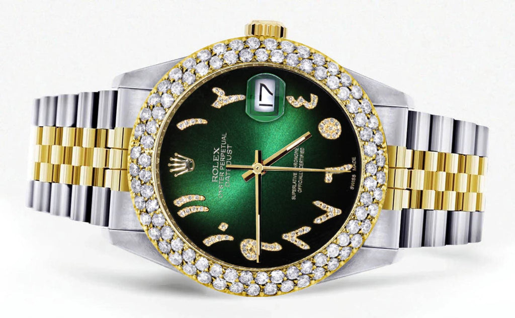 Diamond Gold Rolex Watch For Women 16233 | 36Mm | Green Black Arabic Diamond Dial | Two Row 4.25 Carat Bezel | Jubilee Band