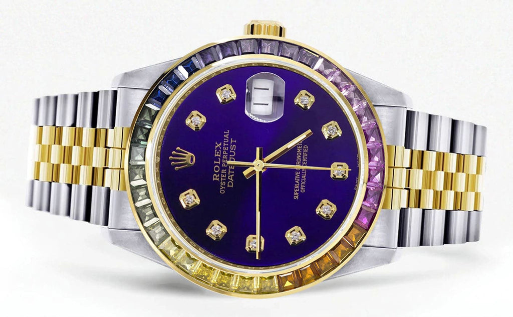 Diamond Gold Rolex Watch For Men 16233 | 36Mm | Rainbow Sapphire Bezel | Royal Blue Dial | Jubilee Band
