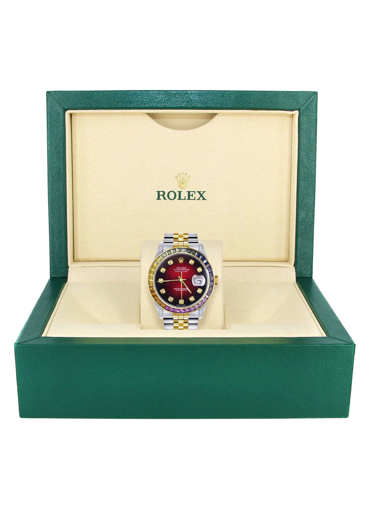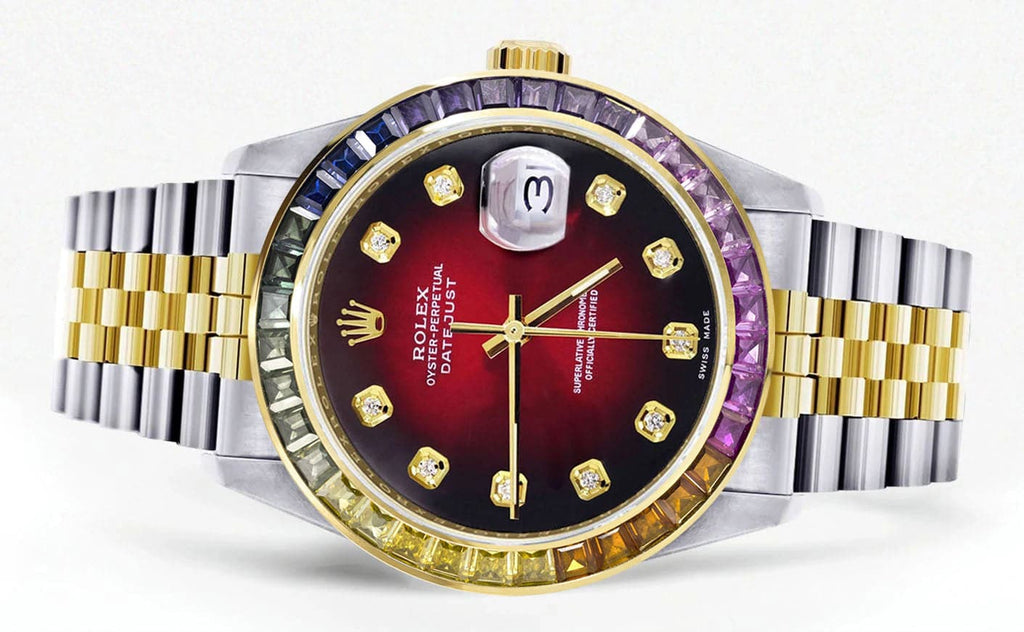 Diamond Gold Rolex Watch For Men 16233 | 36Mm | Rainbow Sapphire Bezel | Red Black Dial | Jubilee Band