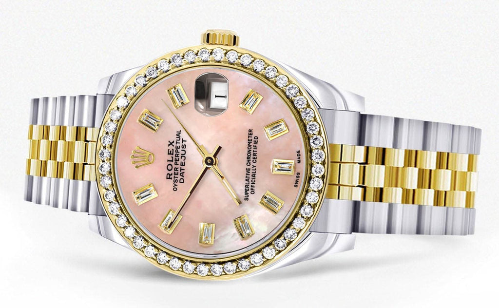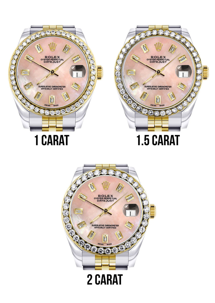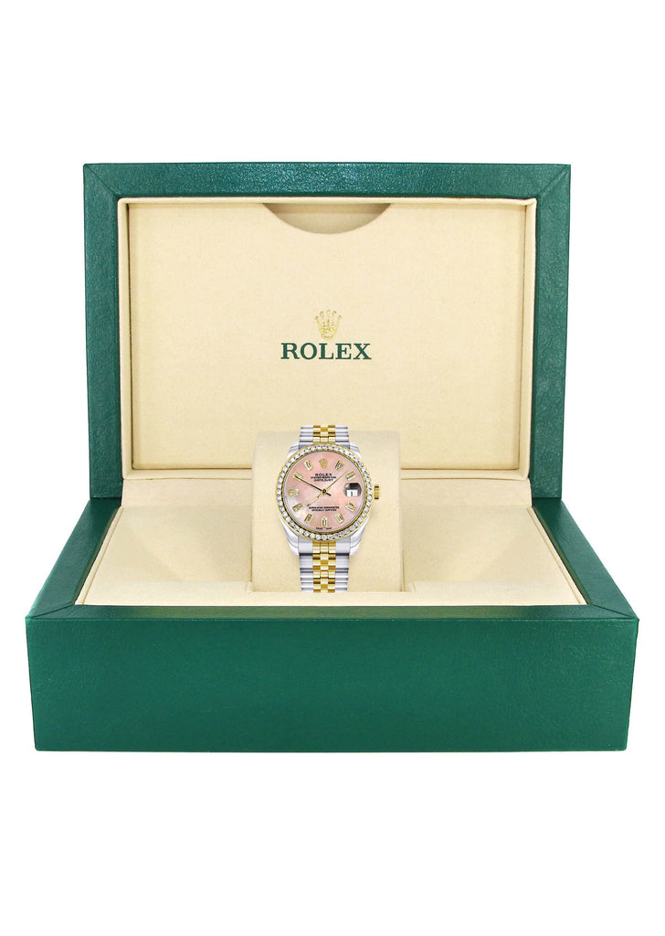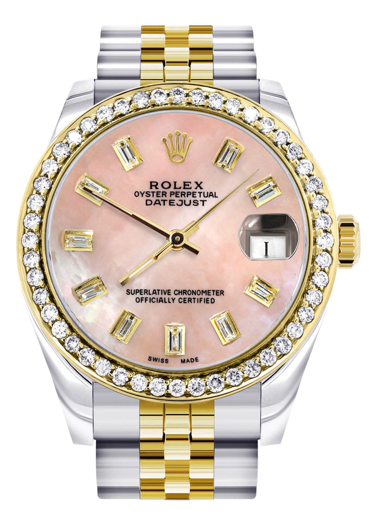 Diamond Gold Rolex Watch | 68273 | Diamond Bezel | 31MM | Pink Mother of Pearl Diamond Dial | Jubilee Band