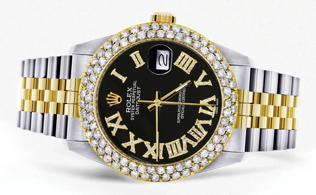 Diamond Gold Rolex Watch For Women 16233 | 36Mm | Black Roman Dial | Two Row 4.25 Carat Bezel | Jubilee Band
