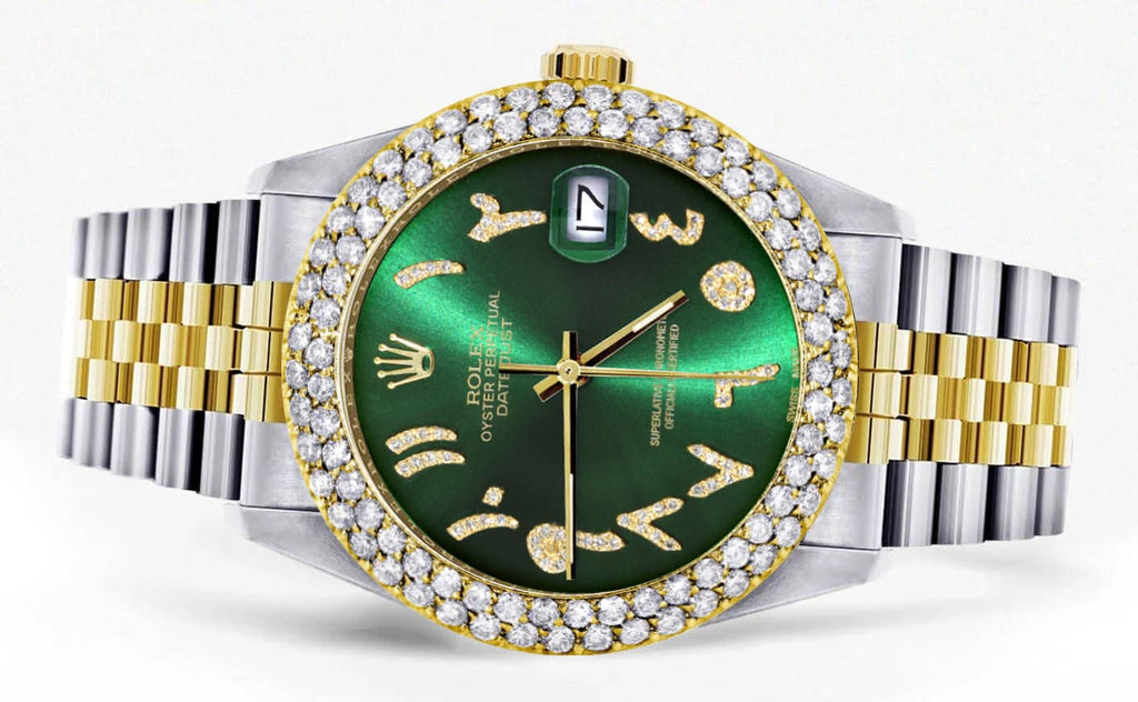Diamond Gold Rolex Watch For Women 16233 | 36Mm | Green Arabic Diamond Dial | Two Row 4.25 Carat Bezel | Jubilee Band