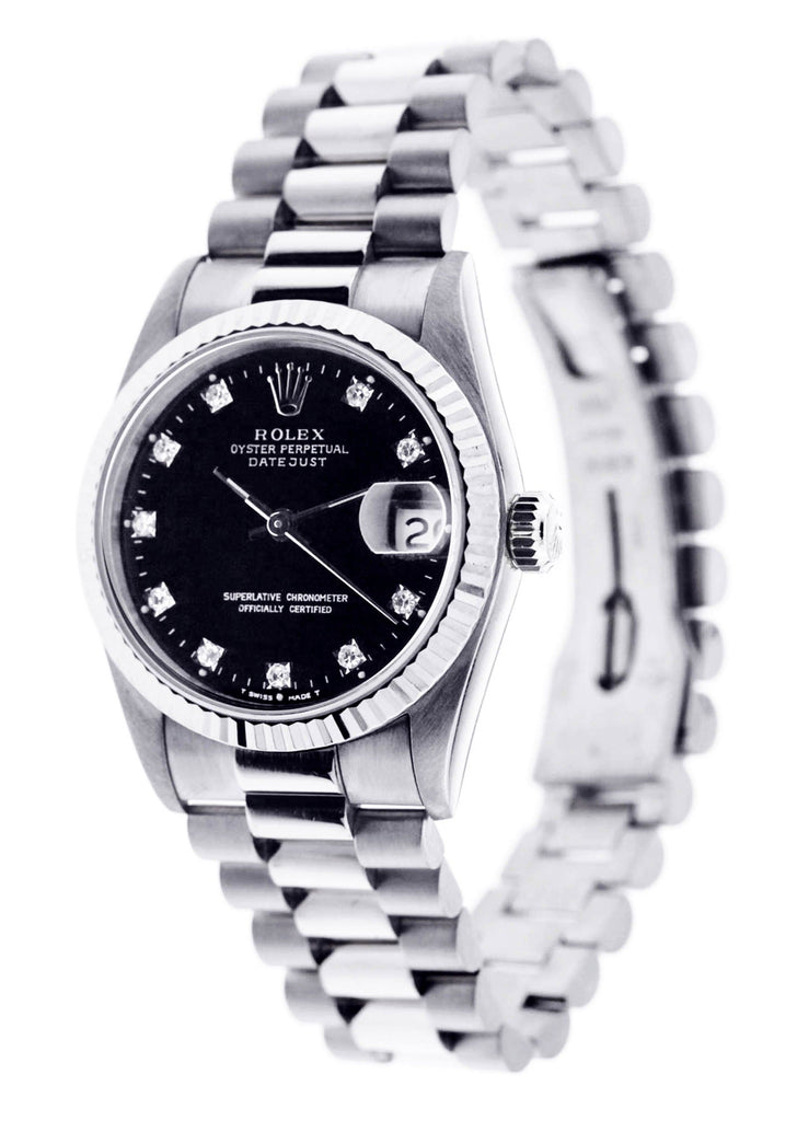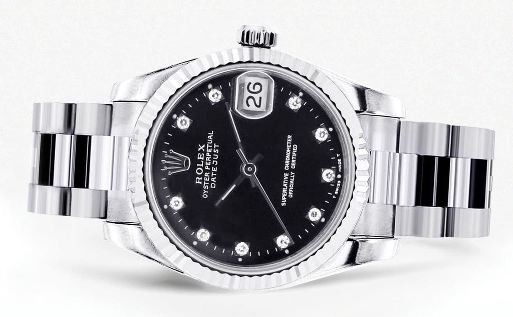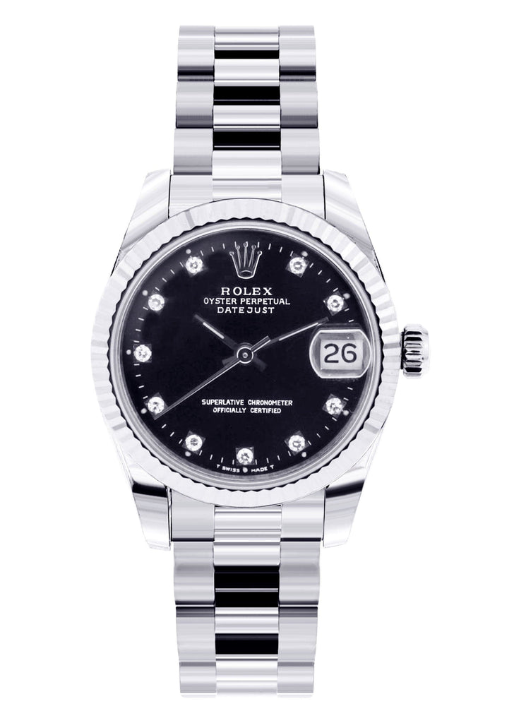 Rolex Datejust Watch For Women | Stainless Steel | Presidential Band | Custom Black Diamond Dial | 31 Mm