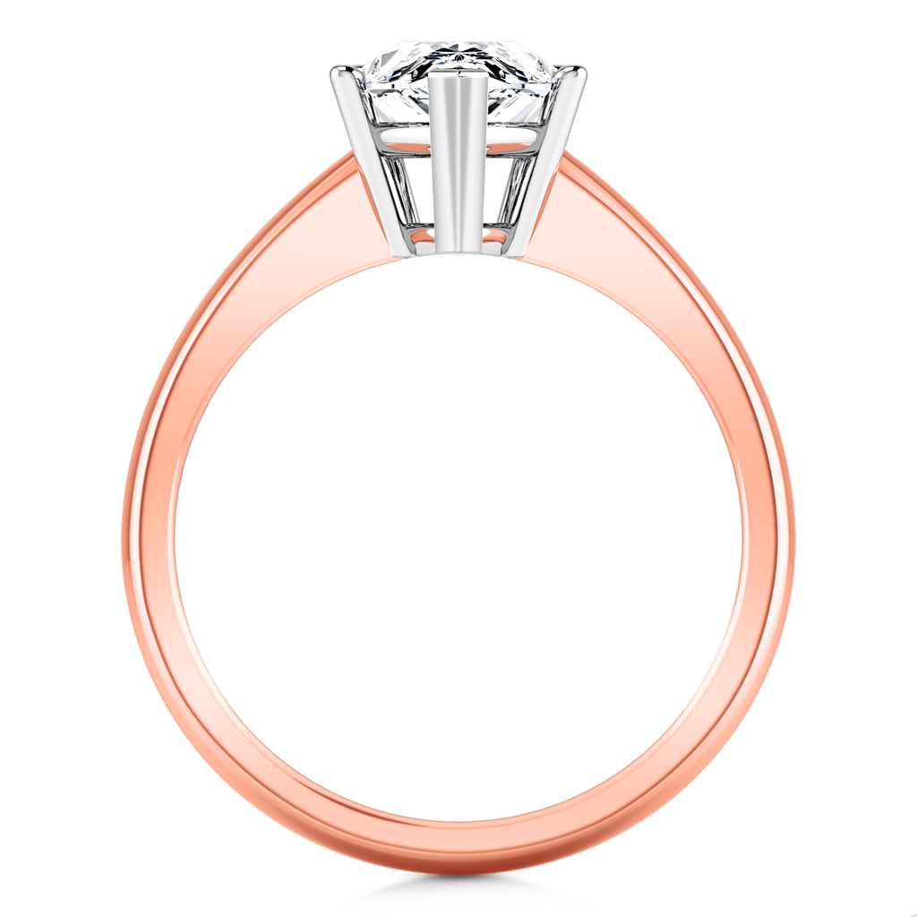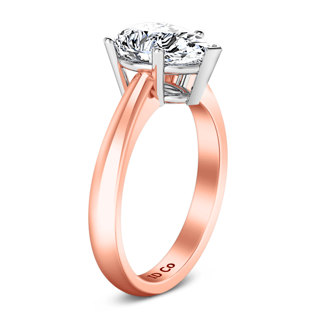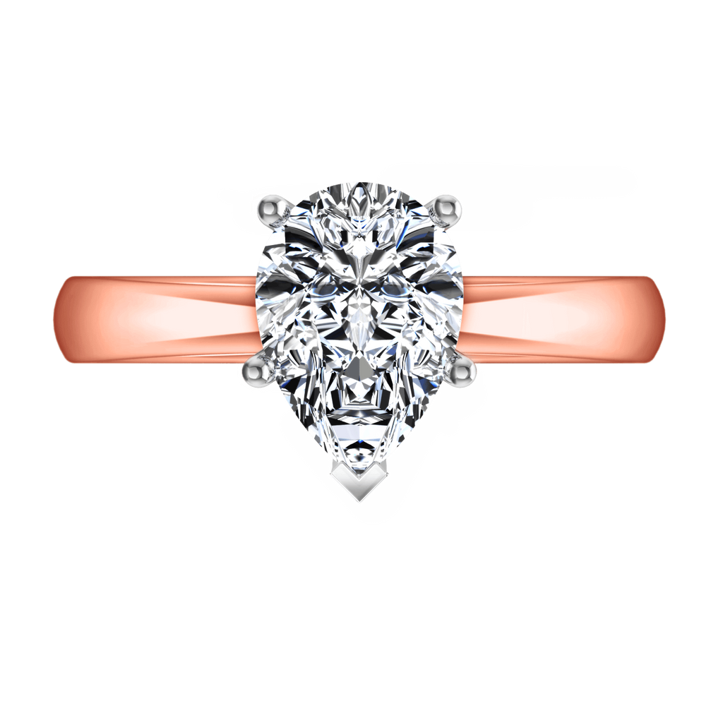 Solitaire engagement ring for the pear shape diamond with rounded edges to create comfort for everyday wear. Featured in 14k rose gold with an average width of 2mm . This ring is fully customizable, so pick your center diamond size, color and clarity and we will custom build it for you.