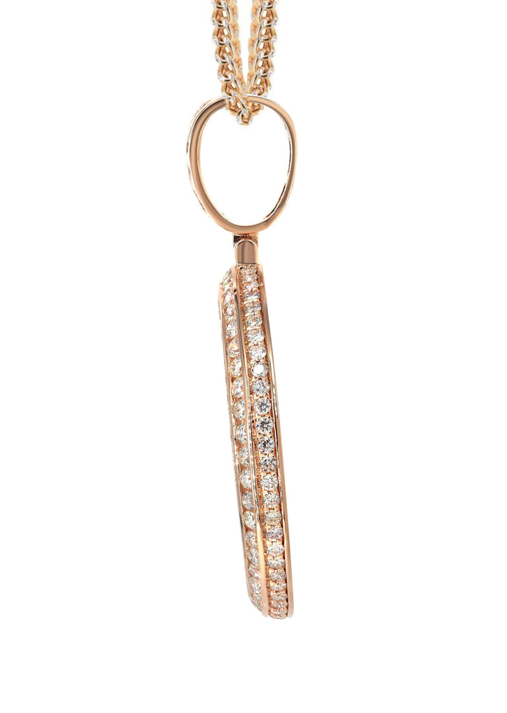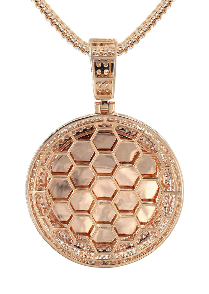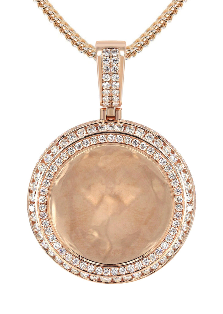 14K Rose Gold Diamond Picture Pendant Necklace which comes in 1.9 Inches in length and 1.3 Inches in width. The chain options include a gold Cuban chain, Franco or Rope with a width of 3 MM and the length can be selected to any preference. Total Gram Weight Is 20.9. Pendant weighs 10.9 grams and the chain weighs approximately 10 Grams. Upon placing order, we will contact you for a picture to put on the pendant. Due to the custom nature of this product, please allow up to 1 week for production. |
