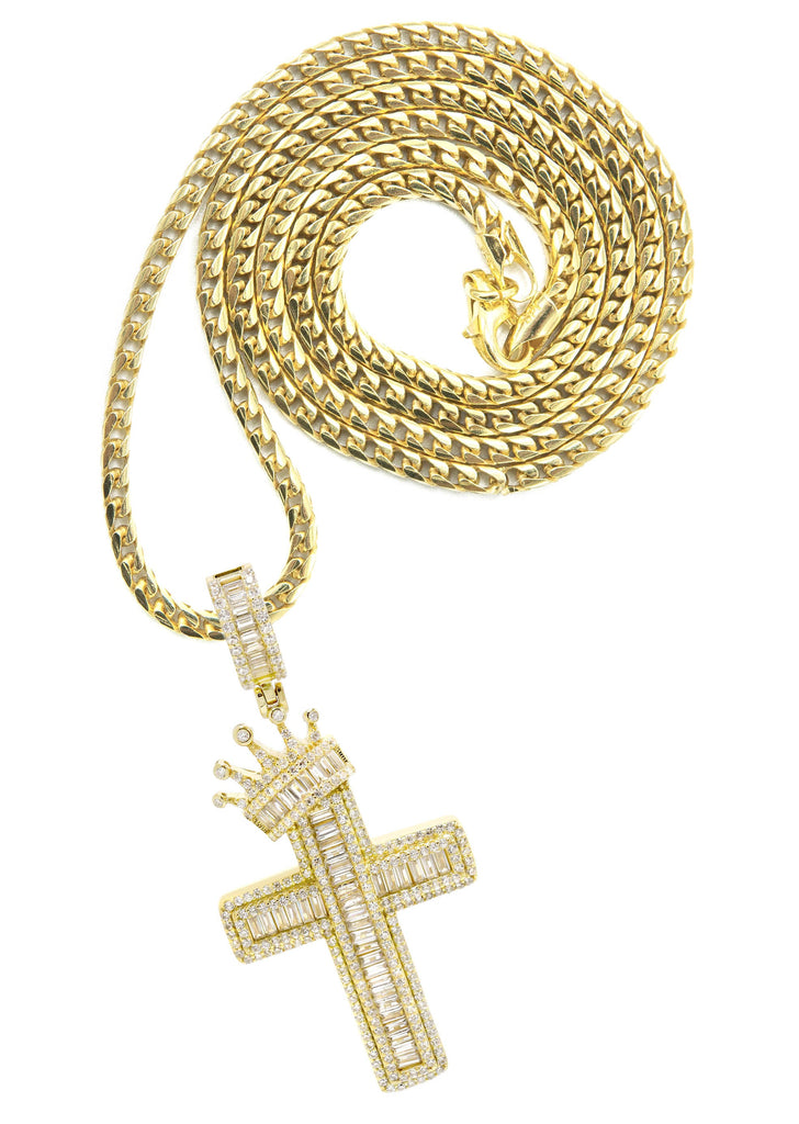Silver Necklace - Gold Crown Cross Baguette Necklace | 23.9 Grams
