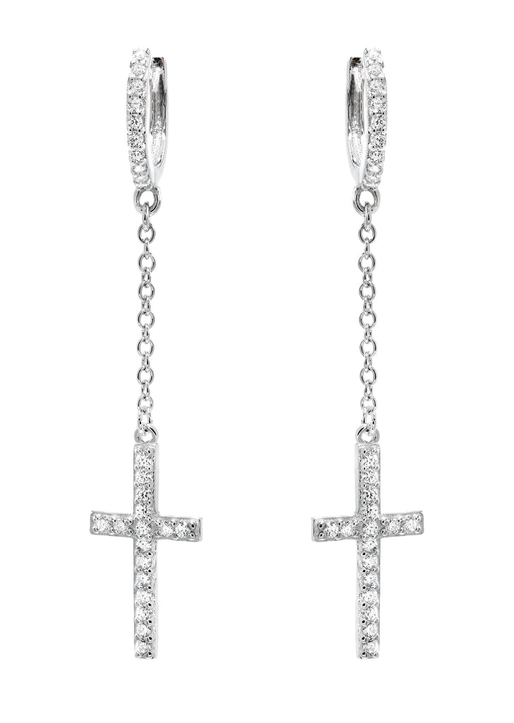 Silver Cross CZ Wire Dangling Hoop Earrings | Appx. 2.5 Grams