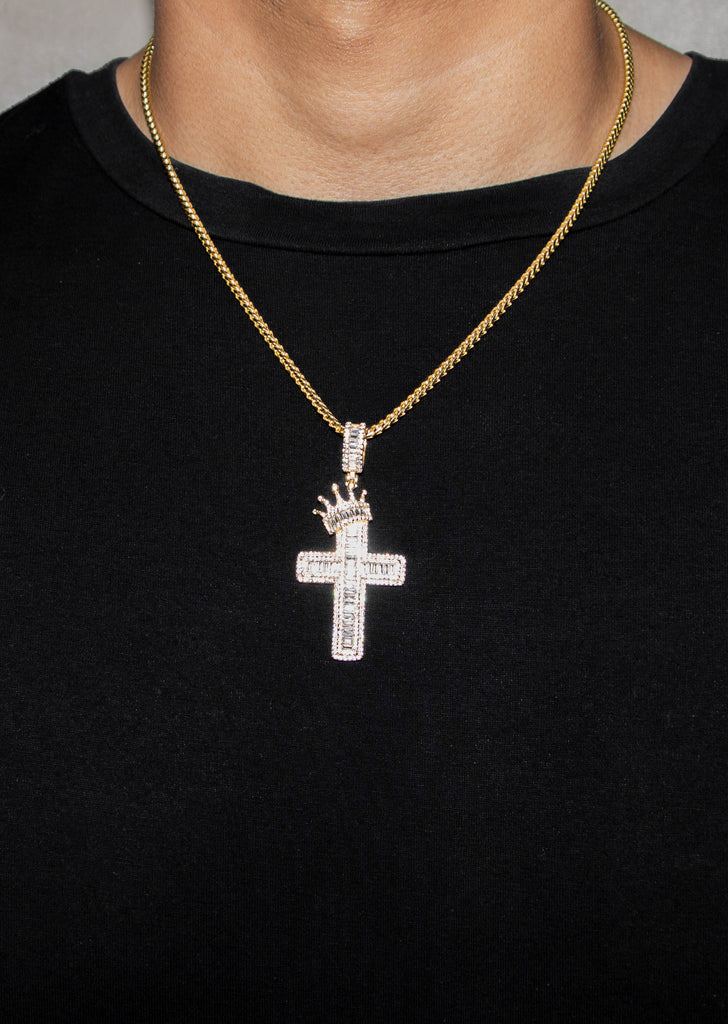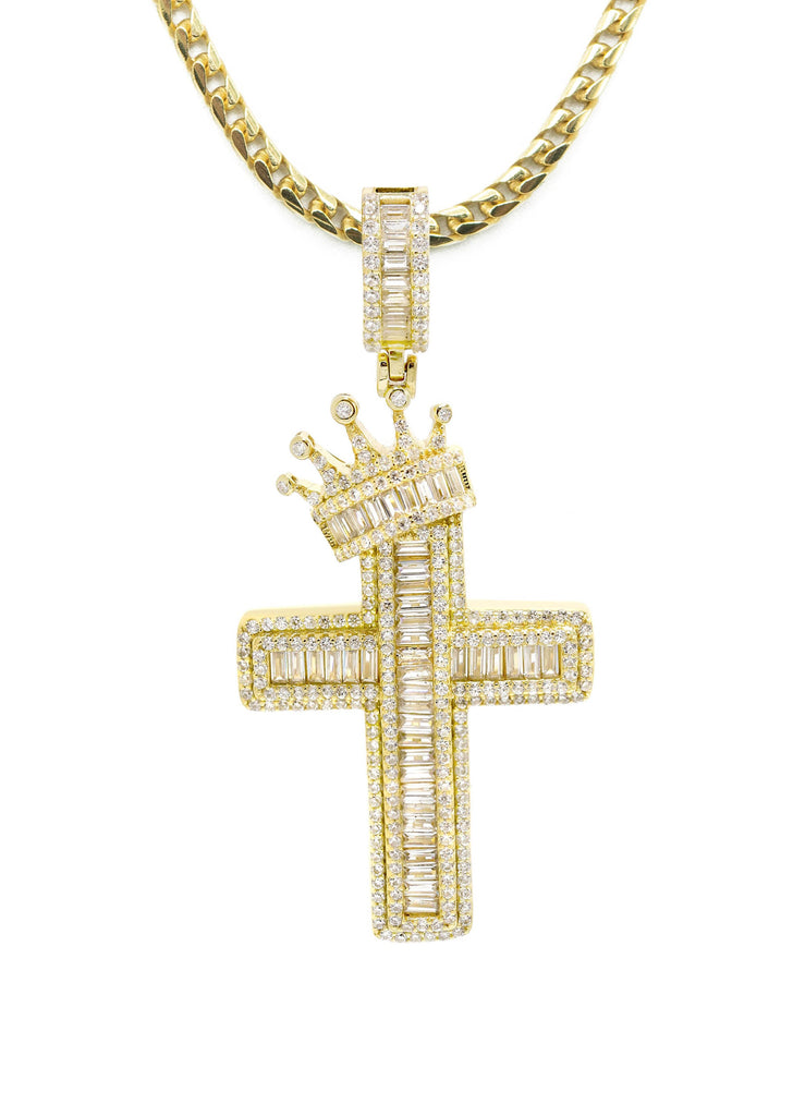 Pure Silver (925) Gold Tone CZ Crown Cross Baguette Pendant with Miami Cuban Chain. 14K Gold bonded 6 times to provide optimum quality. The necklace is fully customizable, so you may pick your length.