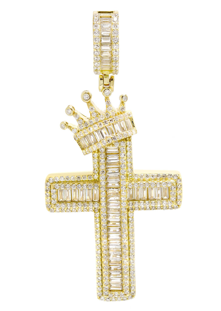Silver Pendant - Gold Crown Cross Baguette Pendant | Appx 9.5 Grams