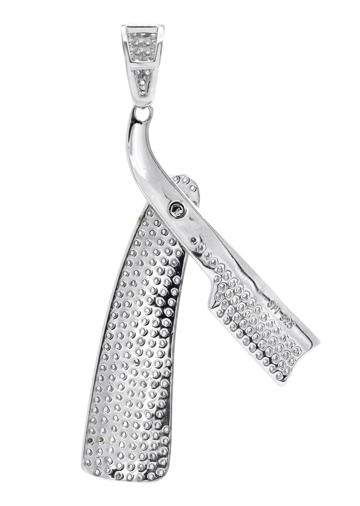 Pure Silver (925) CZ Barber Razor Pendant with Rhodium bonded 6 times to provide optimum quality. Weighs approximately 6.8 Grams.