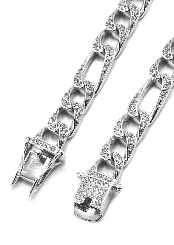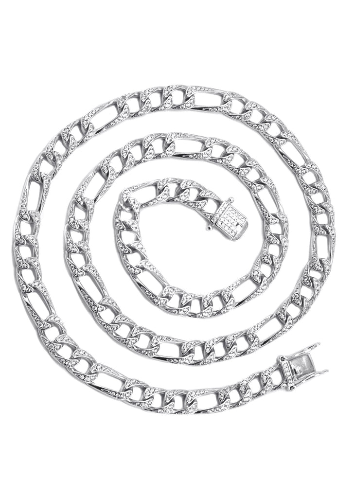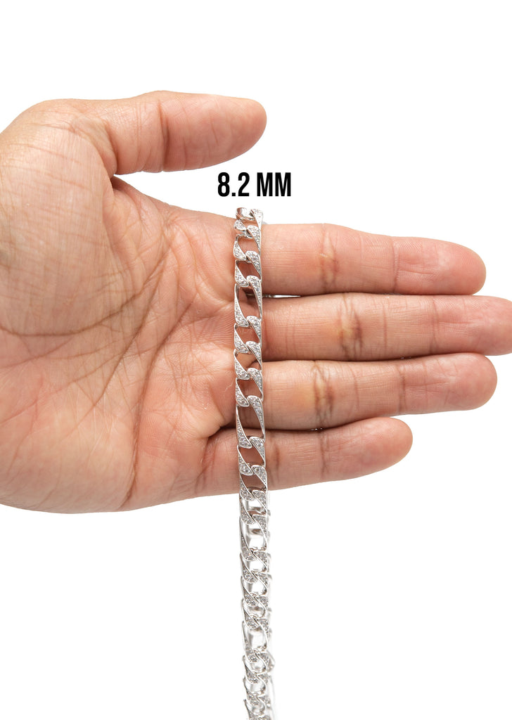Pure Silver (925) Iced Out Figaro Chain in 8.2 mm with Rhodium bonded 6 times to provide optimum quality and durability. These chains are fully customizable, so you can pick your length above. Once you select your length, you can see the adjusted gram weight below the price. The chain is also water proof which will provide long lasting wear under any condition.