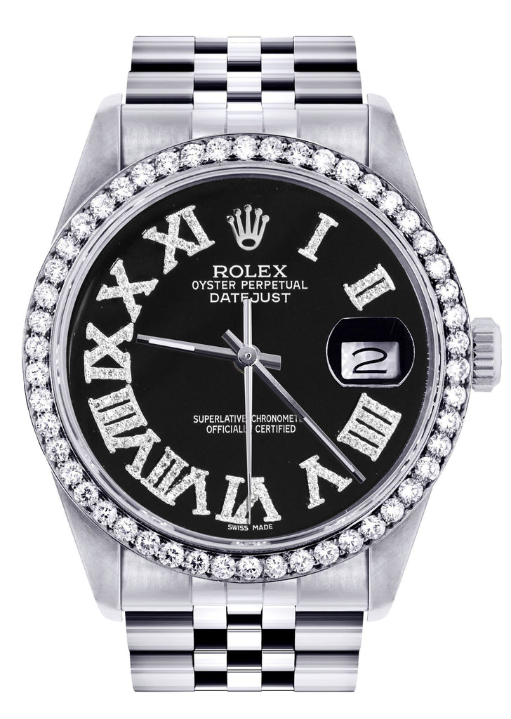 Iced Out Rolex Datejust 36 MM | Stainless Steel | 10 Carats of Diamonds | Black Roman Diamond Dial | Jubilee Band