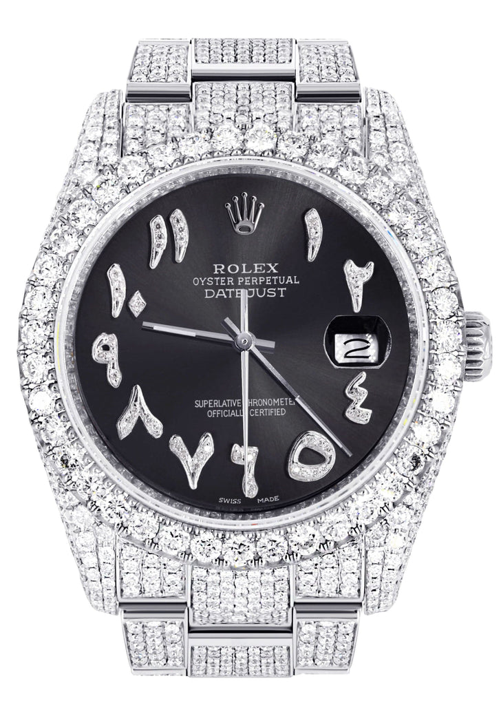 Iced Out Rolex Datejust 36 MM | Stainless Steel | 10 Carats of Diamonds | Black Roman Diamond Dial | Oyster Band