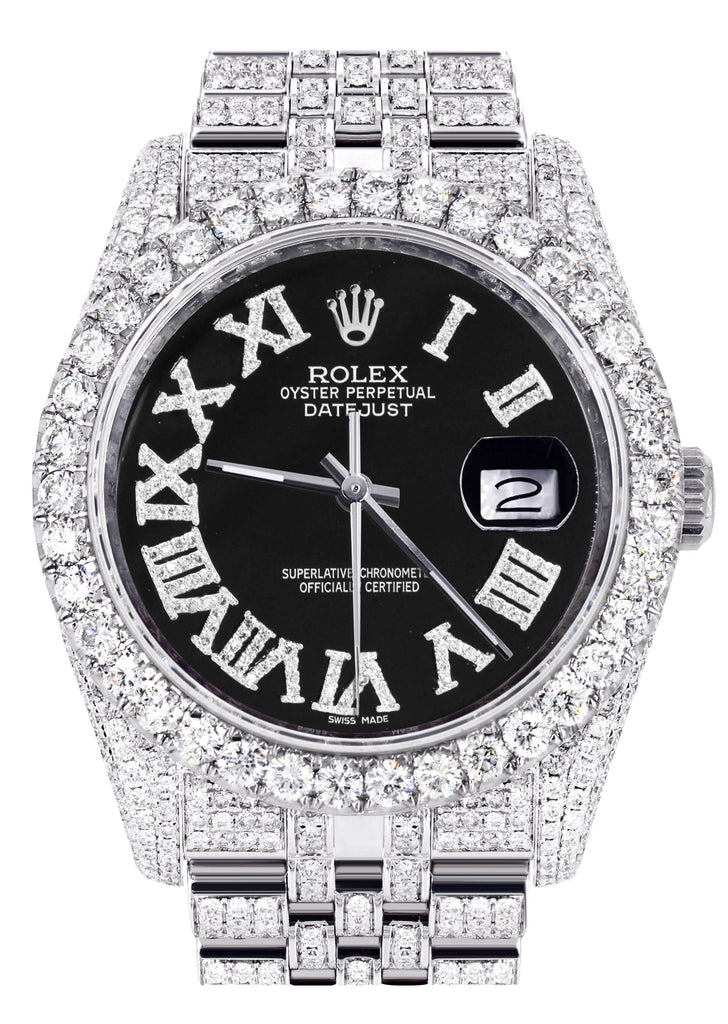 Diamond Iced Out Rolex Datejust 41 | 25 Carats Of Diamonds | Custom Black Roman Numeral Diamond Dial | Two Row | Jubilee Band
