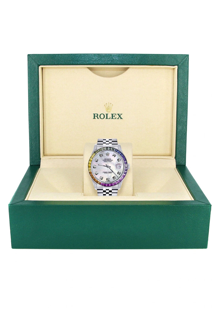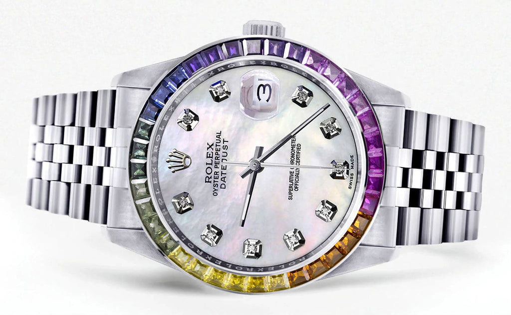 Diamond Gold Rolex Watch For Men 16200 | 36Mm | Rainbow Sapphire Bezel | Mother Of Pearl Dial | Jubilee Band