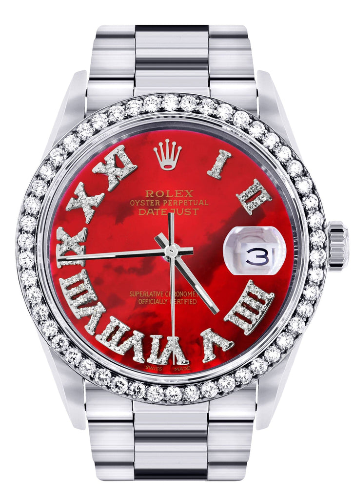 Diamond Mens Rolex Datejust Watch 16200 | 36Mm | Diamond Red Mother Of Pearl Roman Numeral Dial | Jubilee Band