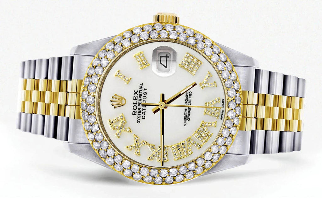 Diamond Gold Rolex Watch For Men 16233 | 36Mm | Diamond White Roman Numeral Dial | Two Row 4.25 Carat Bezel | Jubilee Band
