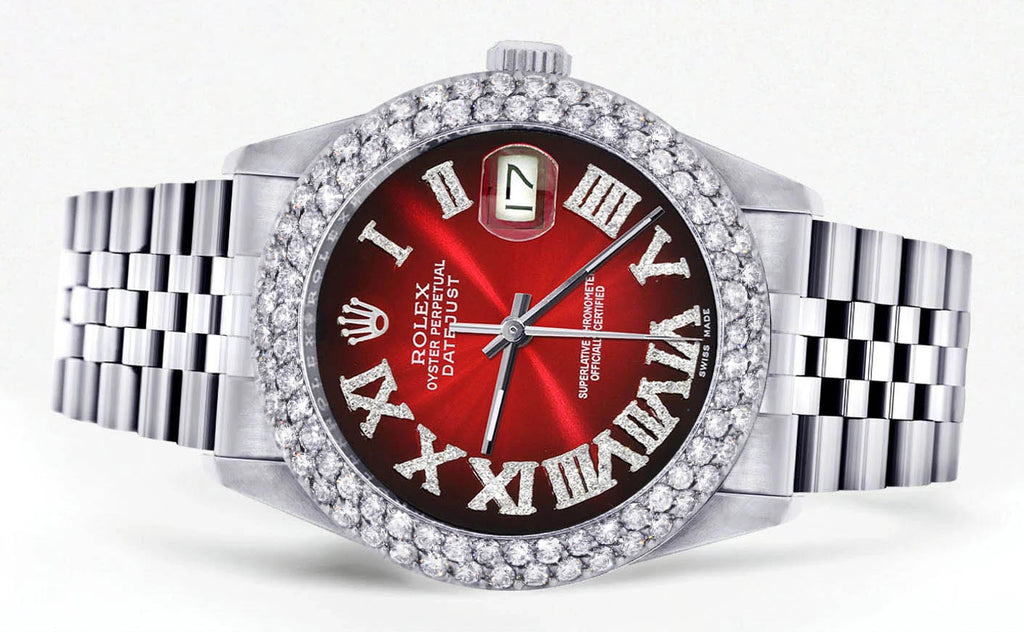 Mens Rolex Datejust Watch 16200 | 36Mm | Red Black Roman Numeral Dial | Two Row 4.25 Carat Bezel | Jubilee Band