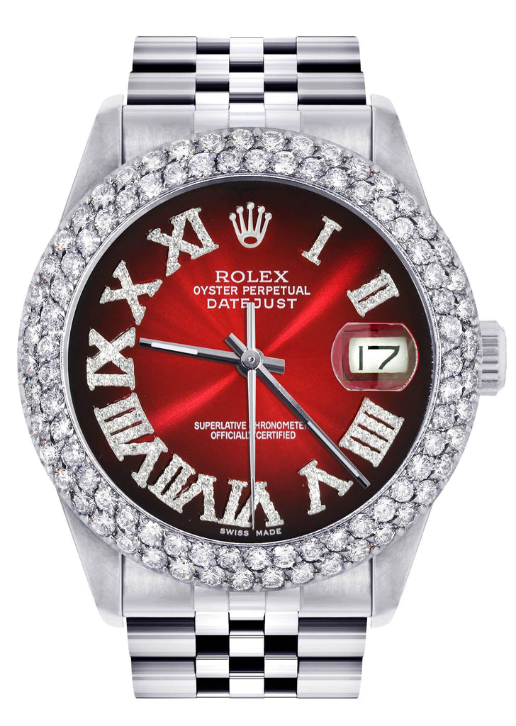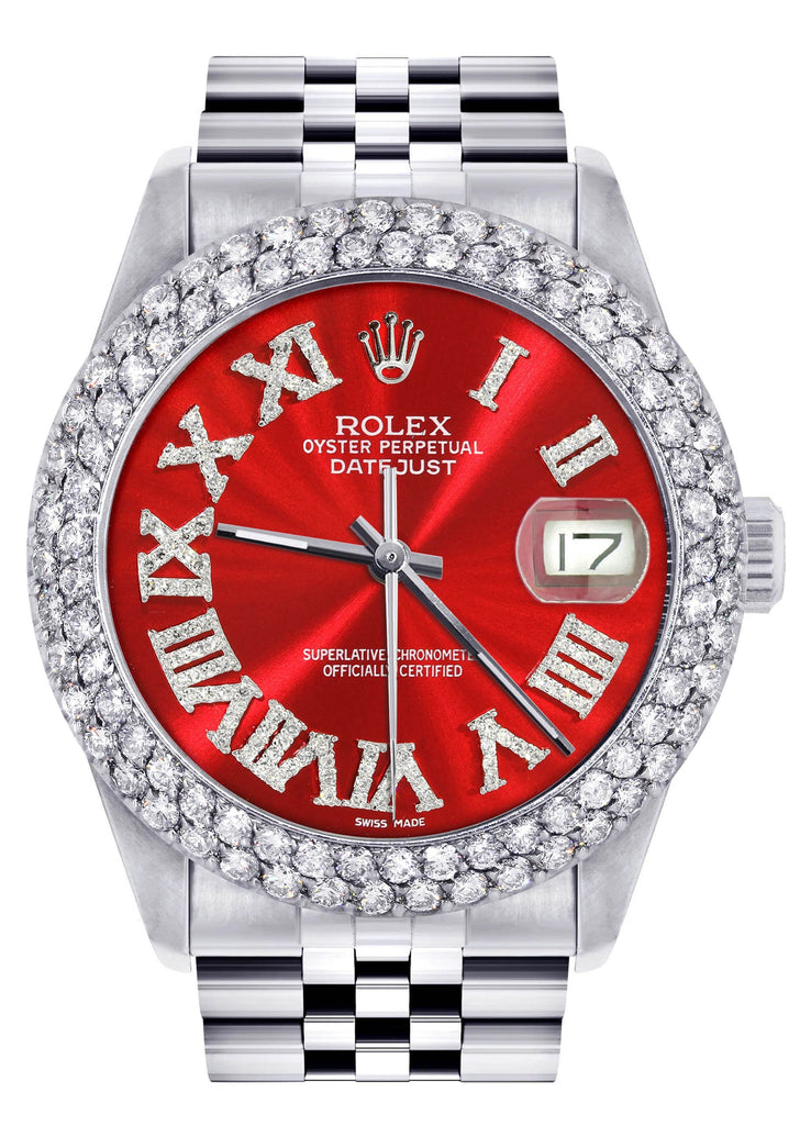 Mens Rolex Datejust Watch 16200 | 36Mm | Red Roman Numeral Dial | Two Row 4.25 Carat Bezel | Jubilee Band