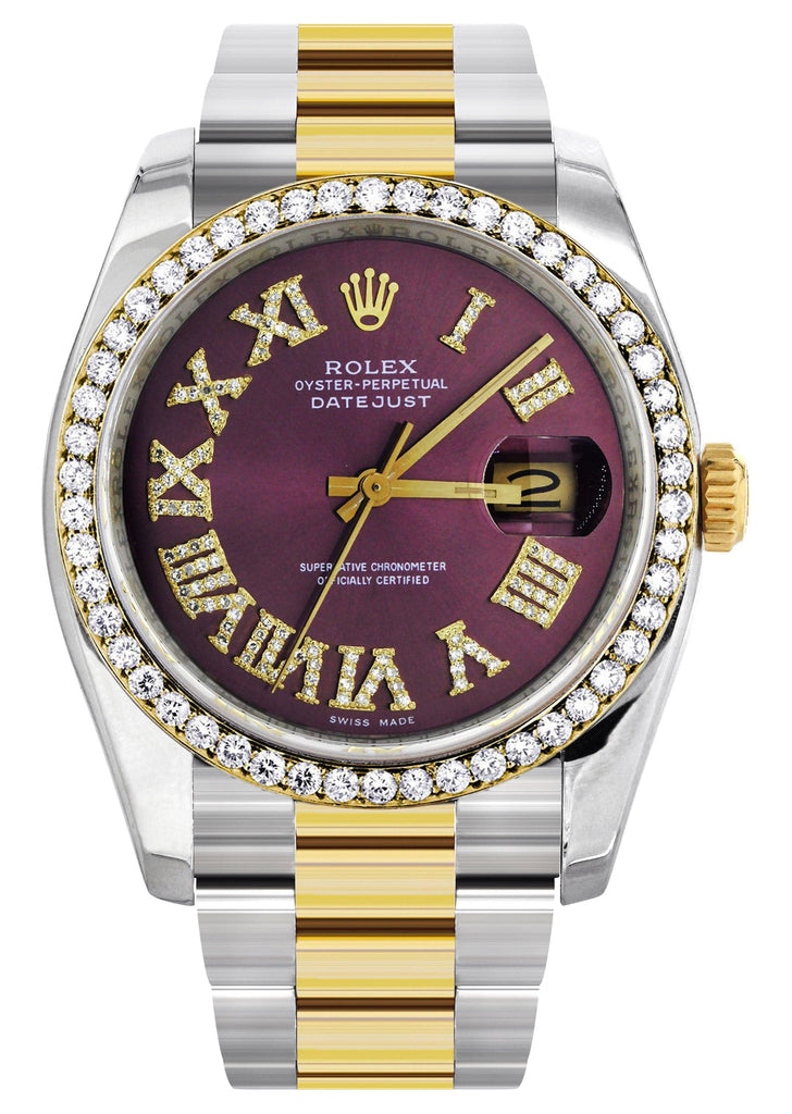 Iced Out Rolex Datejust 36 MM | Two Tone | 10 Carats of Diamonds | Purple Roman Diamond Dial