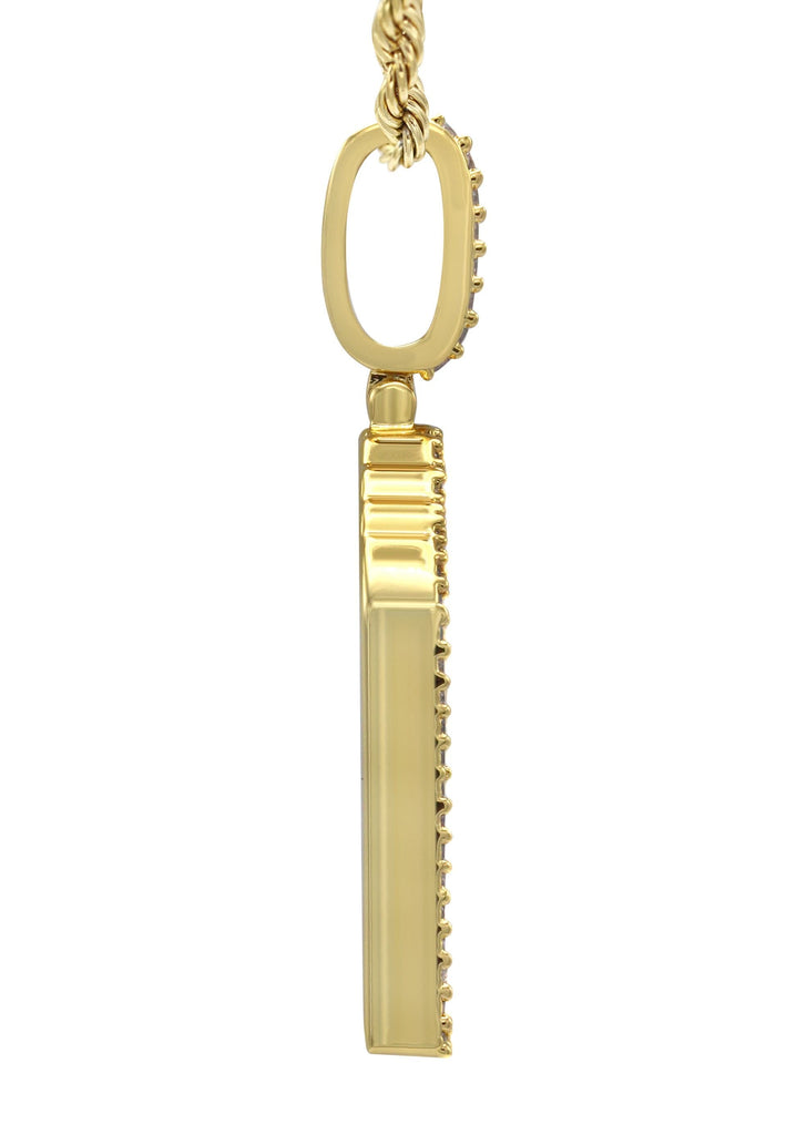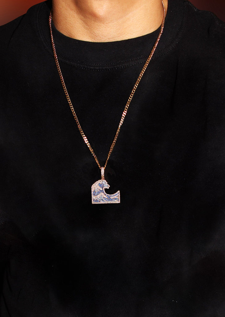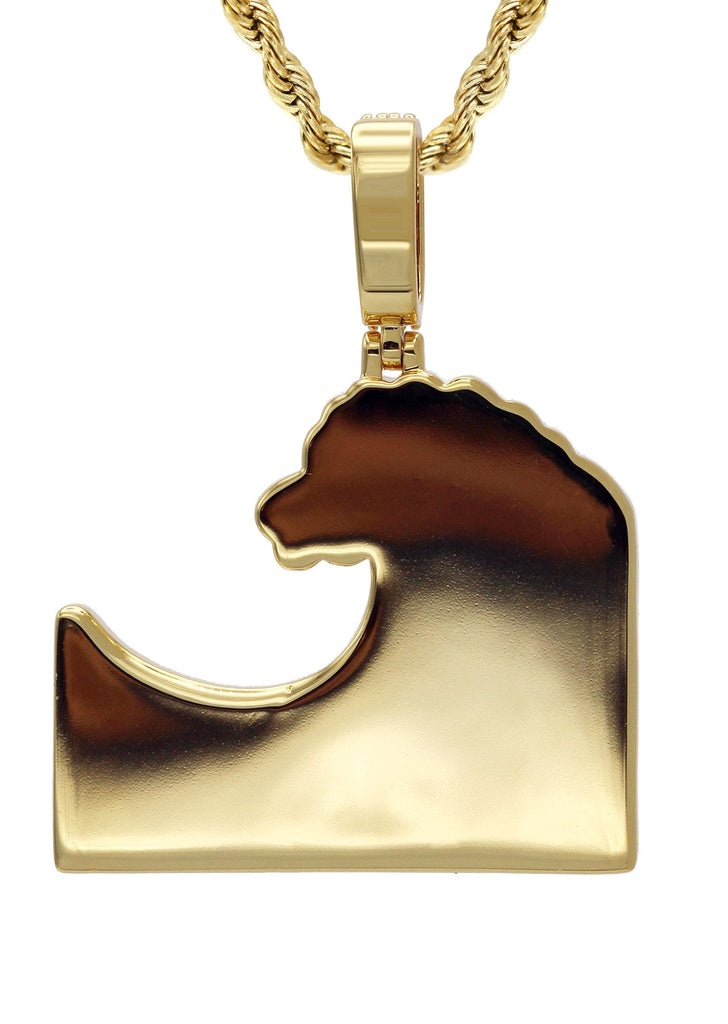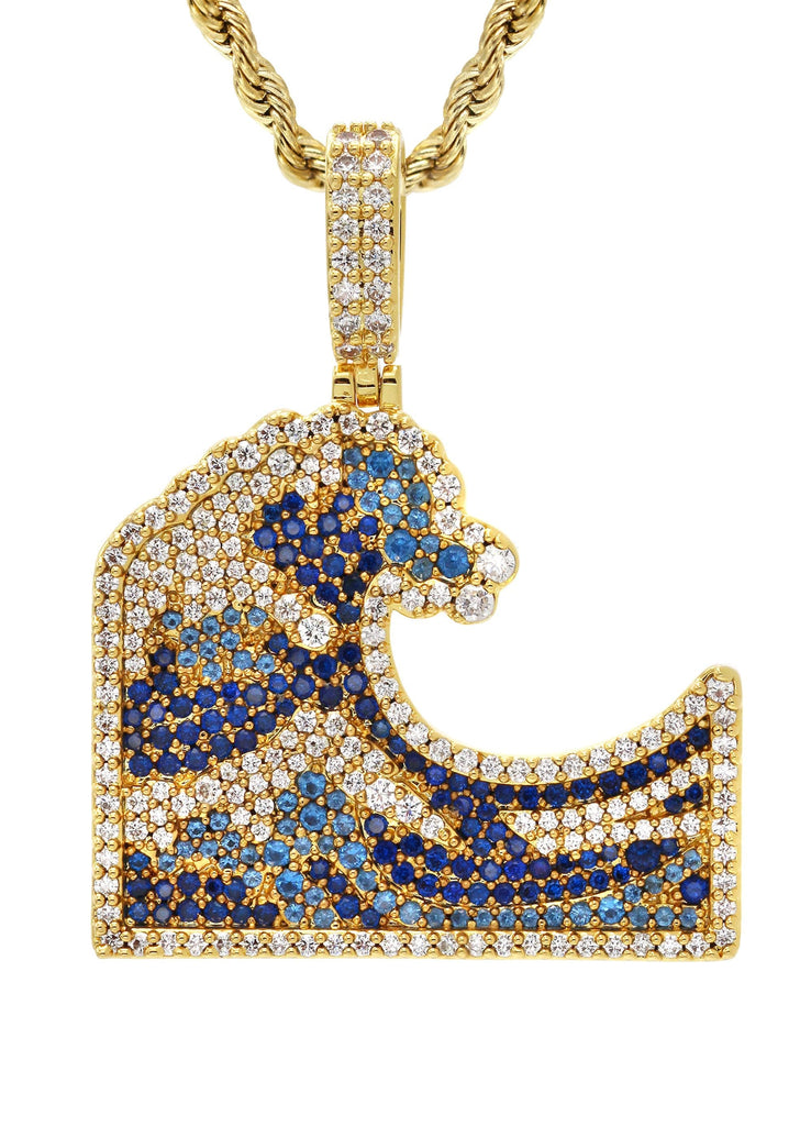 Yellow Gold Plated Rope Chain & Wave Pendant Which weighs 11 Grams. The Width Of The Pendant Is 1.15 Inches And The Length Of The Pendant Is 1.5 Inches. The Width Of The Chain Is 3mm And The Length Can Be Adjusted Above.