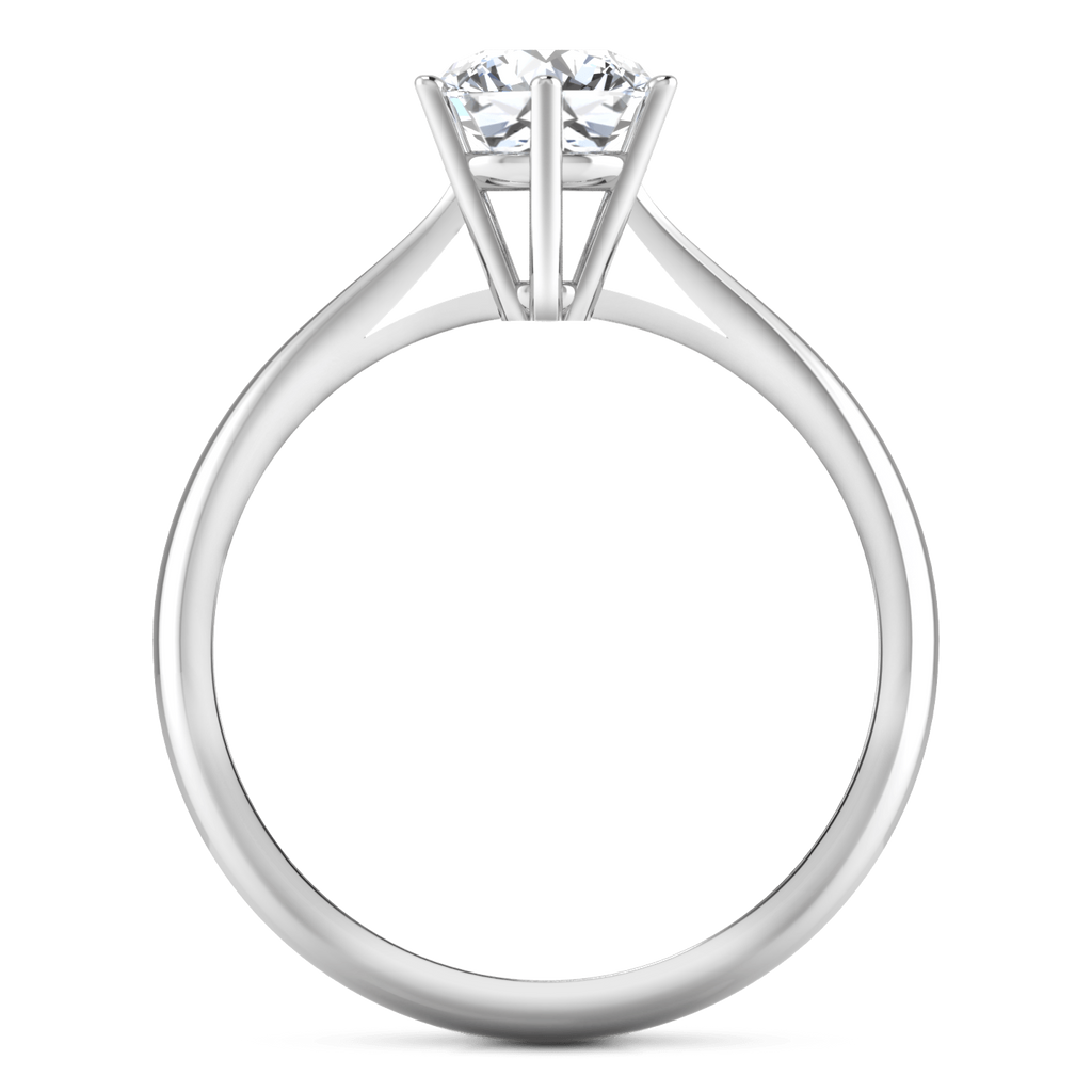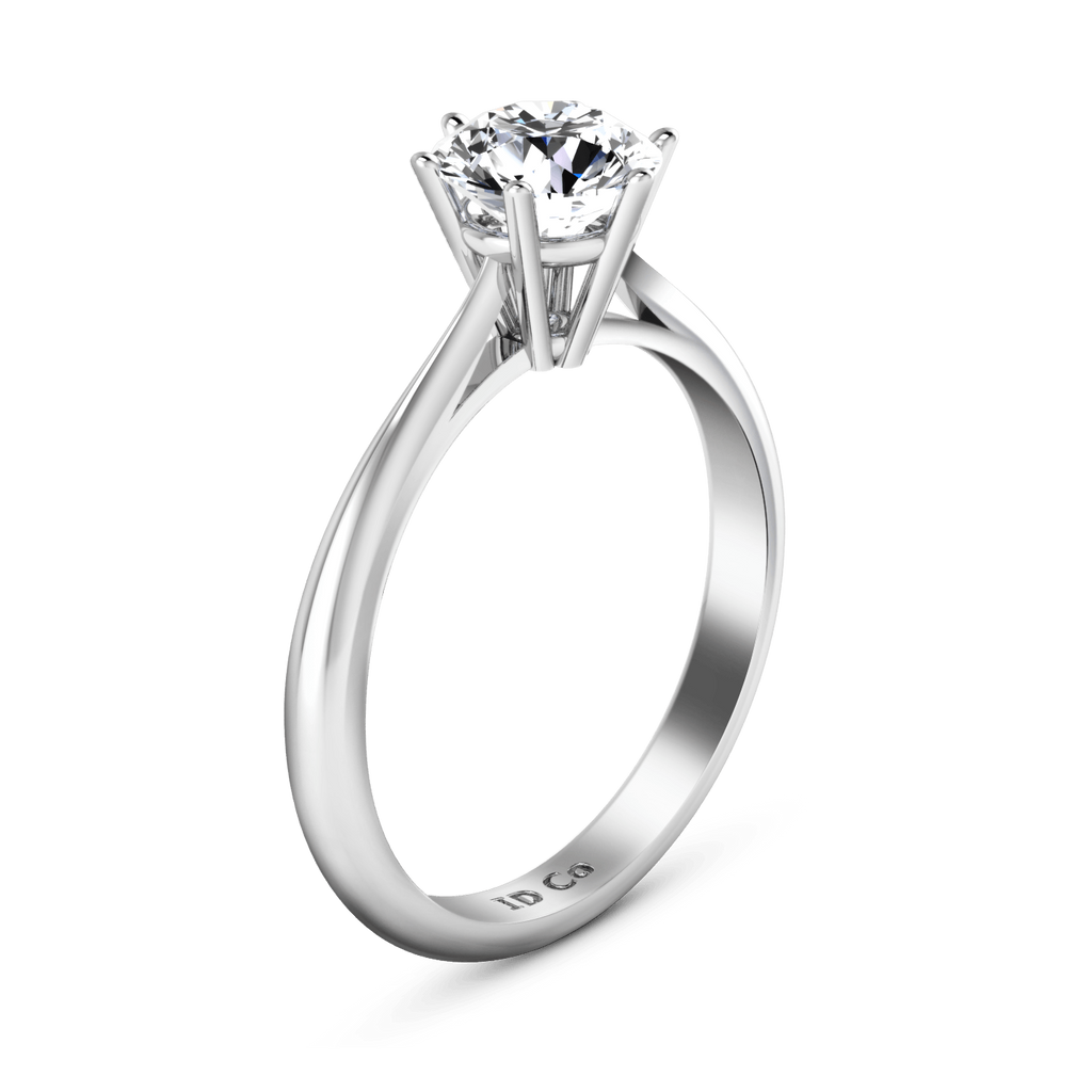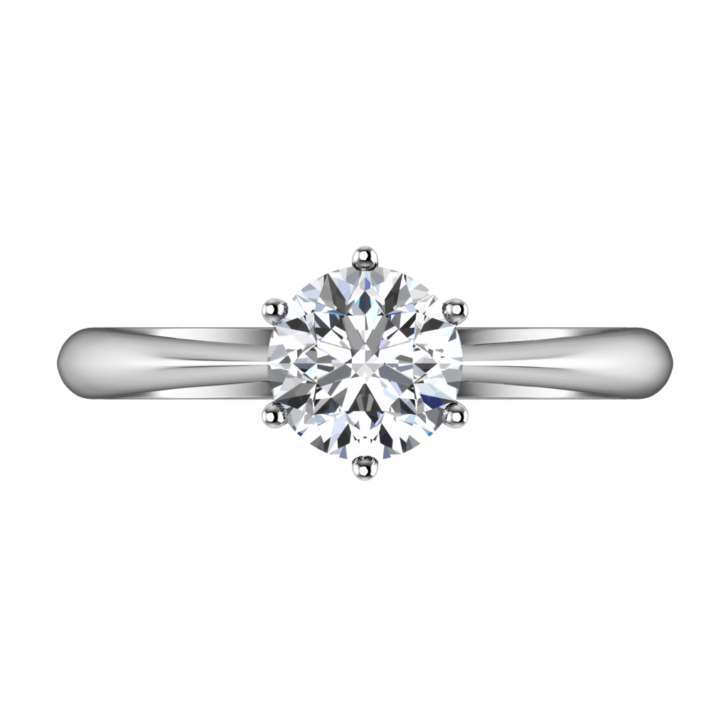 Classic and feminine this ring setting has a six prong basket head with gently tapered shoulders. Featured in 14k white gold with an average width of 2mm . This ring is fully customizable, so pick your center diamond size, color and clarity and we will custom build it for you.