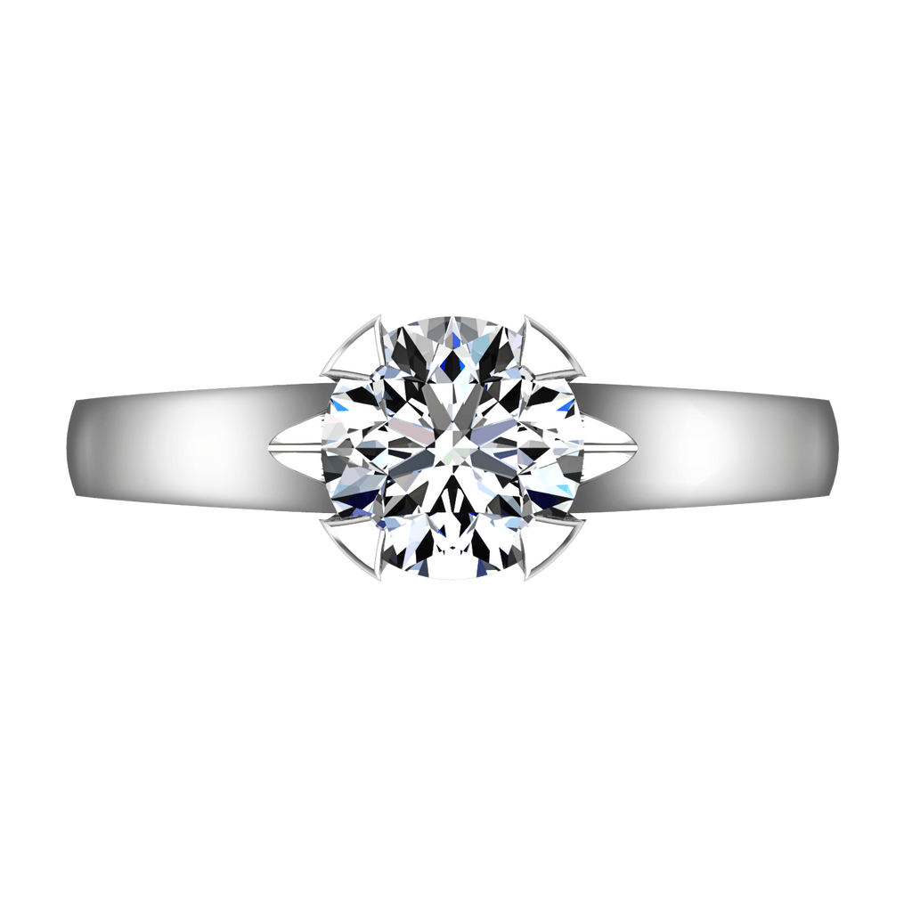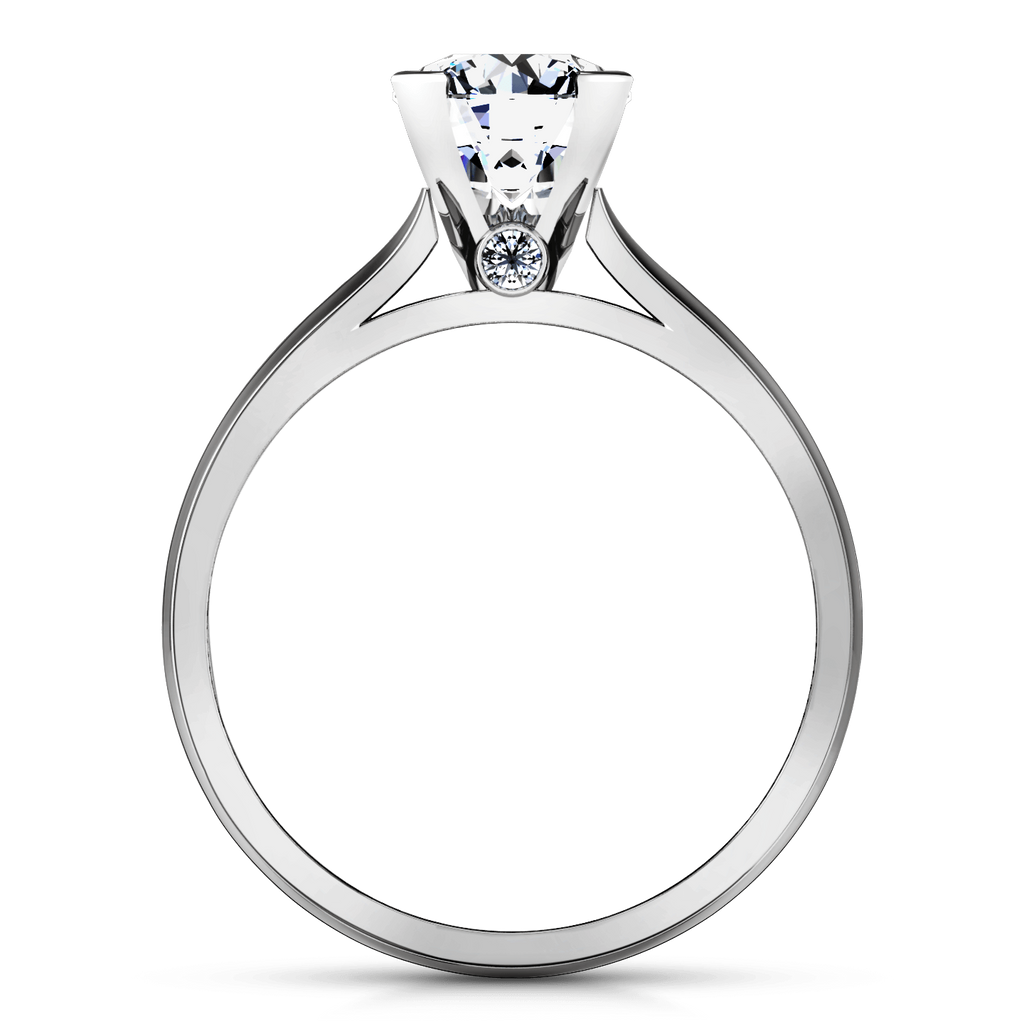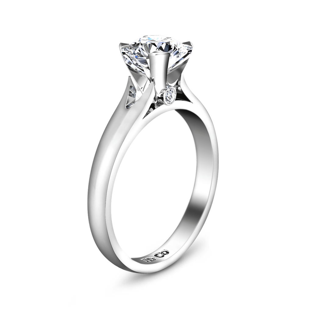 This setting is modern and elegant with a four prong mounting a two accent diamonds embracing the center stone. Featured in 14k white gold with an average width of 2mm . This ring is fully customizable, so pick your center diamond size, color and clarity and we will custom build it for you.