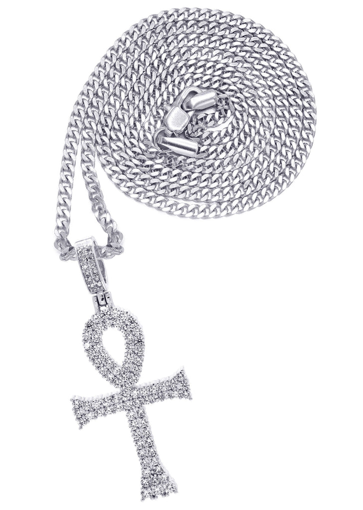 White Gold Plated Cuban Link Chain & Ankh Pendant | Appx. 15.1 Grams