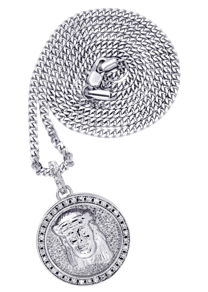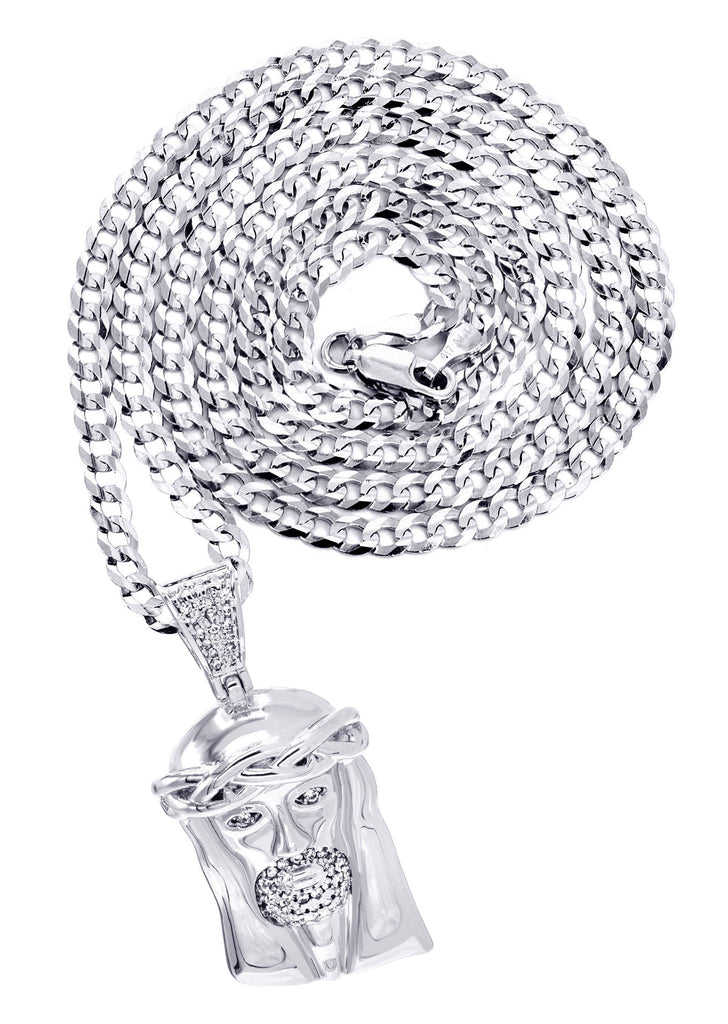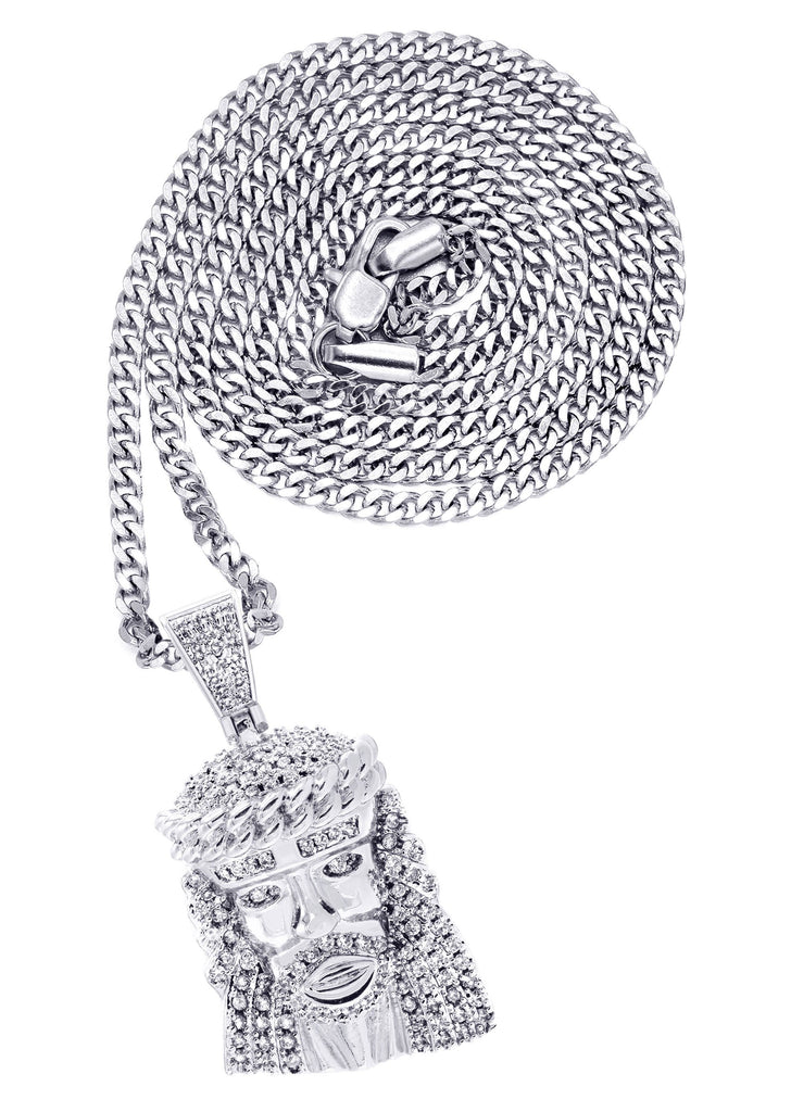 White Gold Plated Cuban Link Chain & Jesus Head Pendant | Appx. 15 Grams