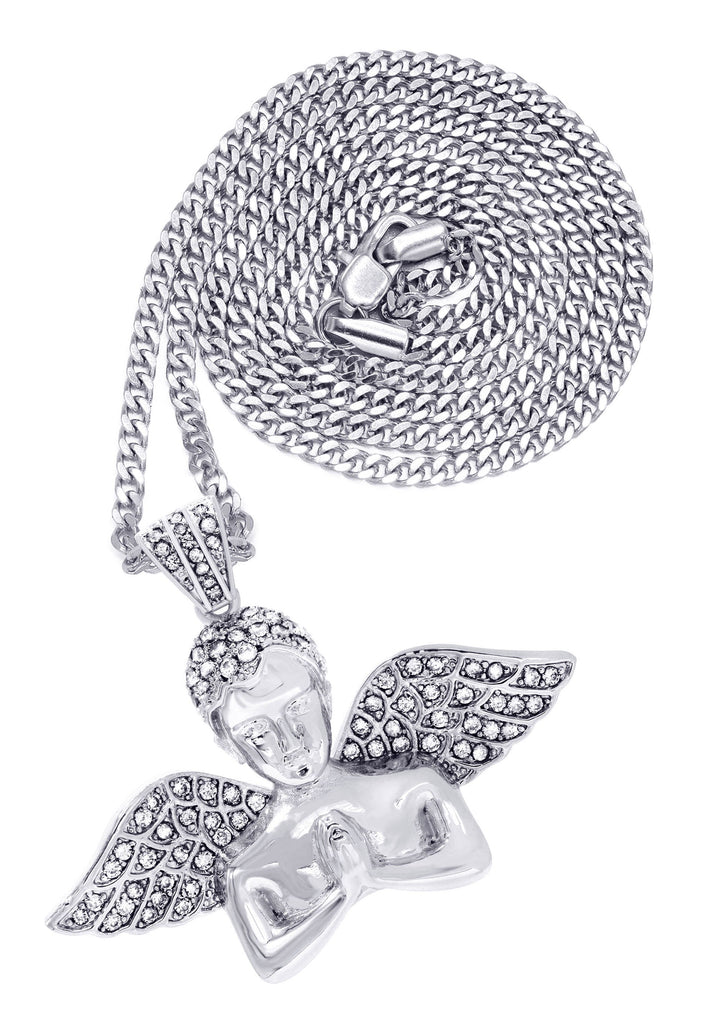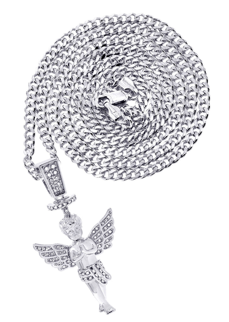 White Gold Plated Cuban Link Chain & Angel Pendant | Appx. 19.4 Grams
