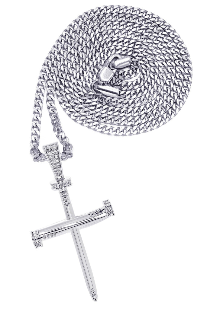 White Gold Plated Cuban Link Chain & Cross Pendant | Appx. 14.5 Grams