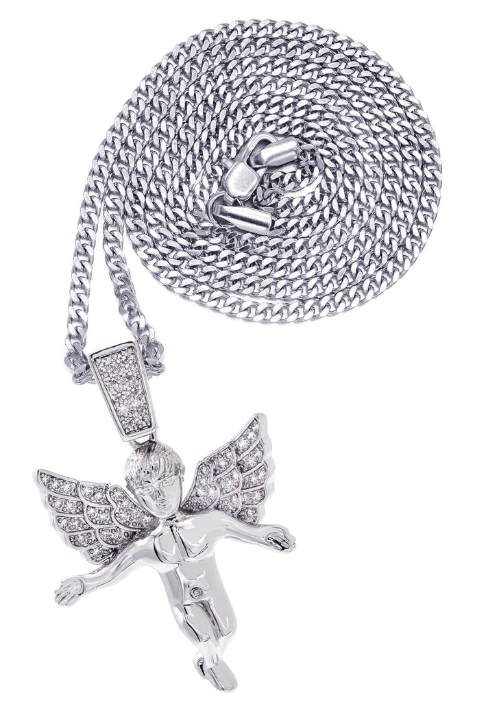 White Gold Plated Cuban Link Chain & Angel Pendant | Appx. 14.2 Grams