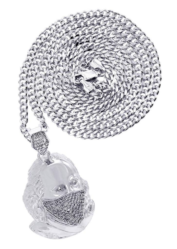 White Gold Plated Cuban Link Chain & Masked Benjamin Franklin Pendant | Appx. 32.1 Grams