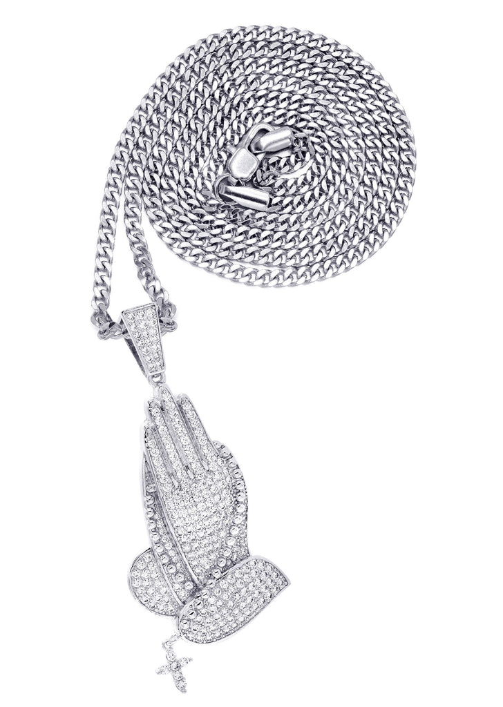 White Gold Plated Cuban Link Chain & Praying Hands Pendant | Appx. 28 Grams