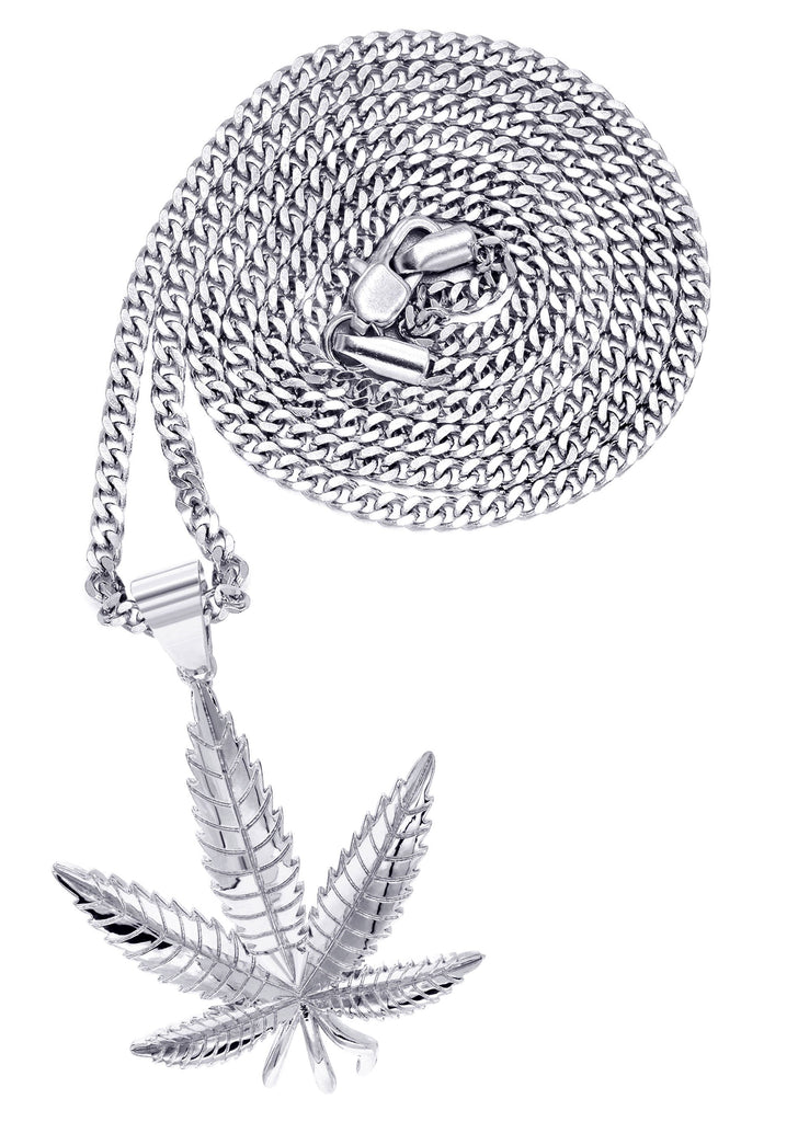 White Gold Plated Cuban Link Chain & Marihuana Leaf Pendant | Appx. 17.4 Grams