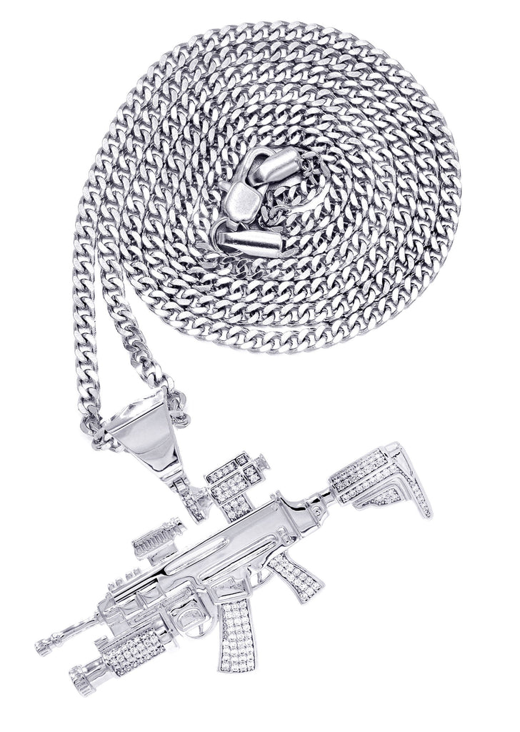White Gold Plated Cuban Link Chain & Gun Pendant | Appx. 31.9 Grams