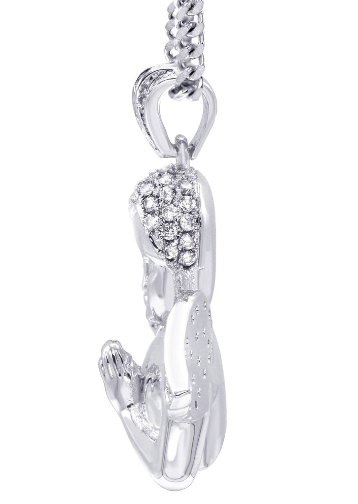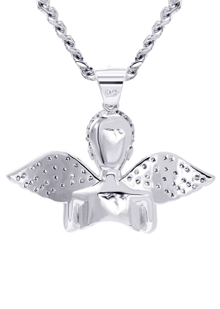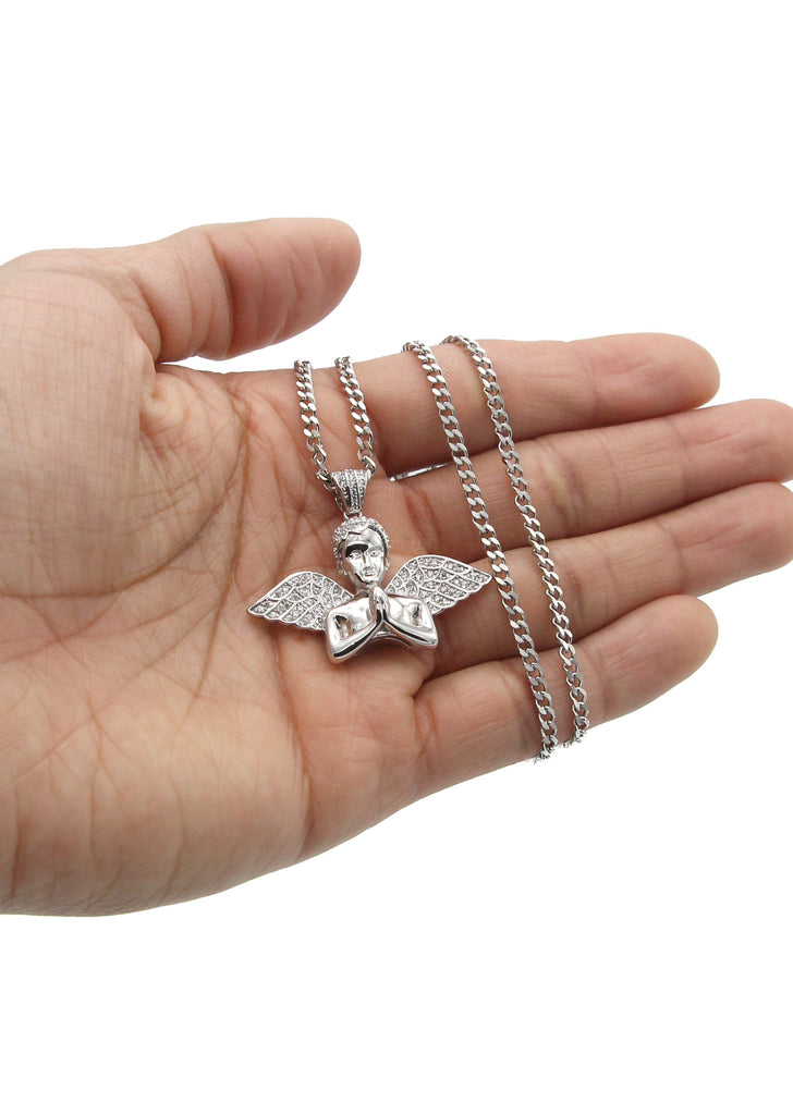 White Gold Plated Cuban Link Chain & Angel Pendant Which weighs 19.4 Grams. The Width Of The Pendant Is 1.6 Inches And The Length Of The Pendant Is 1.3 Inches. The Width Of The Chain Is 3mm And The Length Can Be Adjusted Above.
