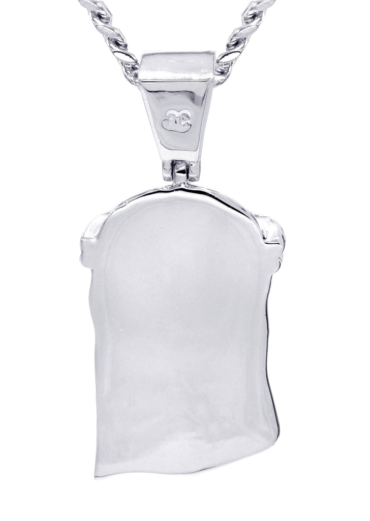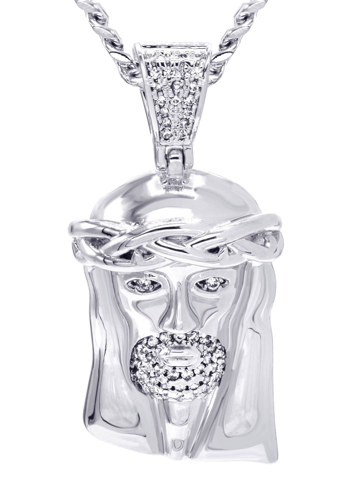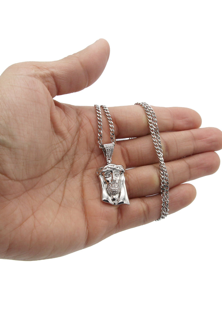 White Gold Plated Cuban Link Chain & Jesus Head Pendant Which weighs 20.1 Grams. The Width Of The Pendant Is 0.7 Inches And The Length Of The Pendant Is 1.5 Inches. The Width Of The Chain Is 3mm And The Length Can Be Adjusted Above.