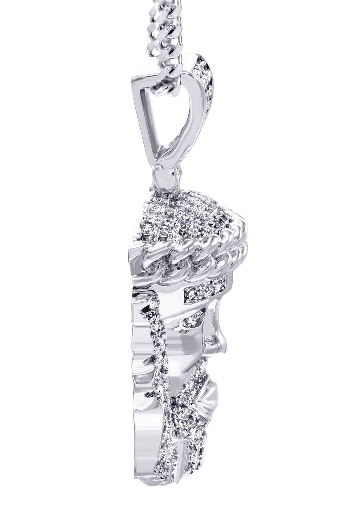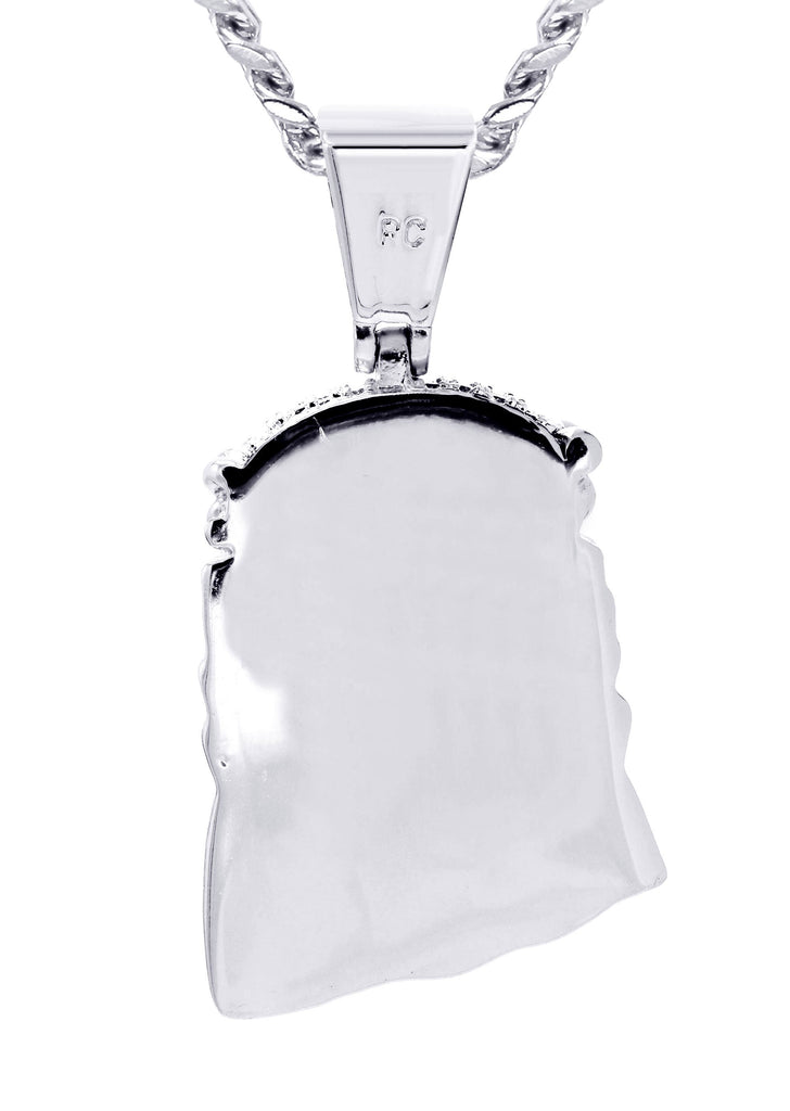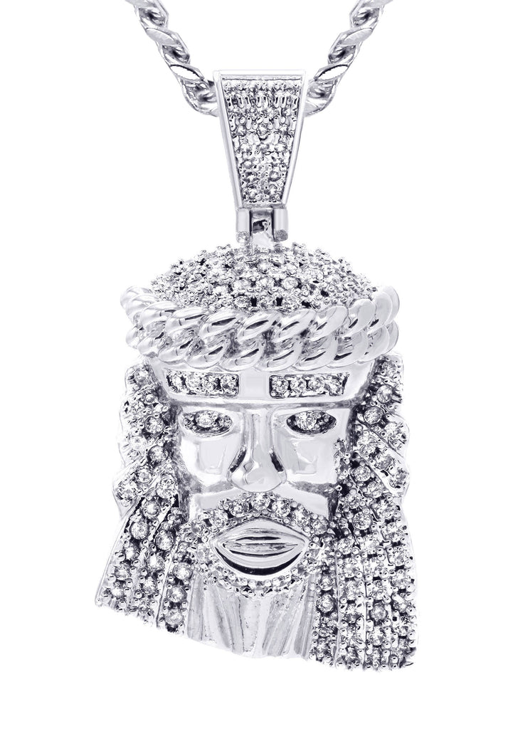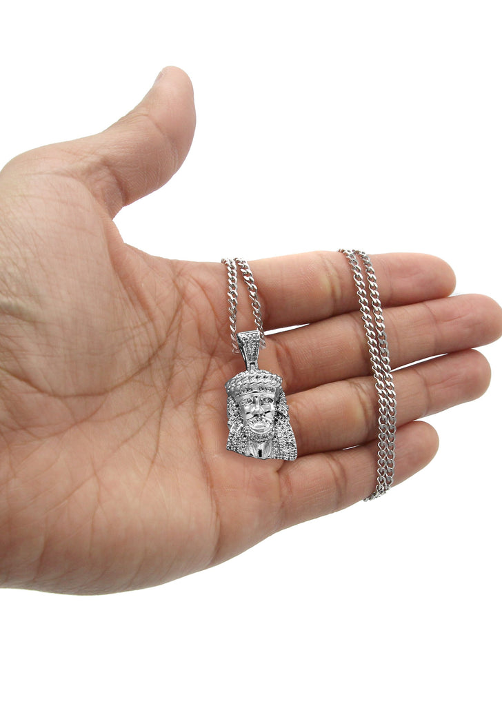 White Gold Plated Cuban Link Chain & Jesus Head Pendant Which weighs 22.7 Grams. The Width Of The Pendant Is 0.8 Inches And The Length Of The Pendant Is 1.5 Inches. The Width Of The Chain Is 3mm And The Length Can Be Adjusted Above.