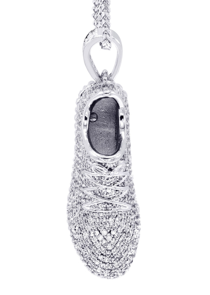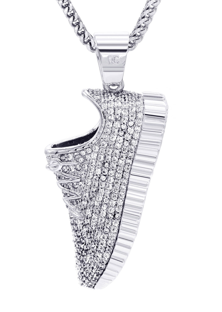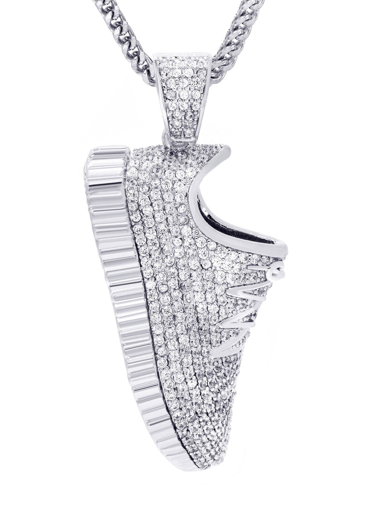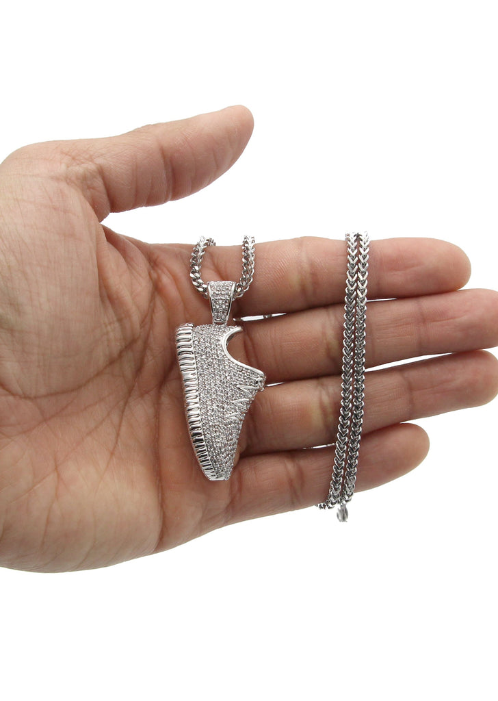 White Gold Plated Cuban Link Chain & Sneaker Pendant Which weighs 30.9 Grams. The Width Of The Pendant Is 1 Inches And The Length Of The Pendant Is 2.1 Inches. The Width Of The Chain Is 3mm And The Length Can Be Adjusted Above.