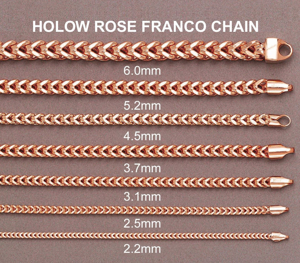 Ladies Semi Solid Rose Franco Chain | 14K Rose Gold. This chain is fully customizable, so you can pick your length and width above. Once you selected your length and width, you can see the adjusted gram weight above the price.