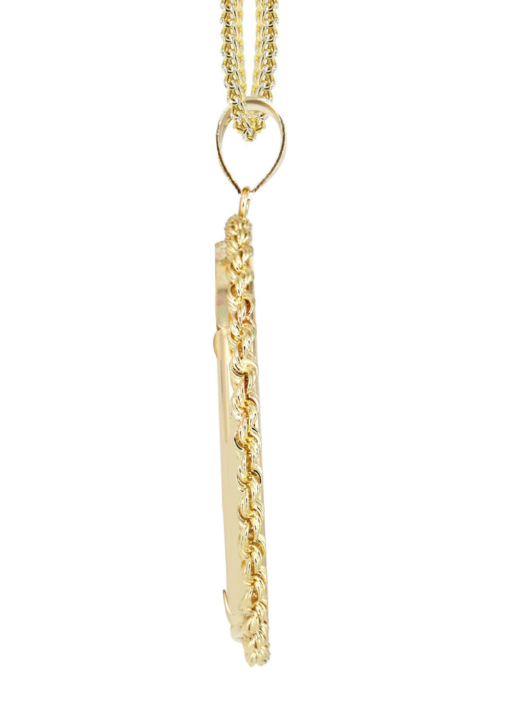 14K Yellow Gold Picture Pendant Necklace which comes in 1.6 Inches in length and 1.2 Inches in width. The chain options include a 14K gold Cuban chain, Franco or Rope with a width of 3 MM and the length can be selected to any preference. Pendant can be order with chain or by itself