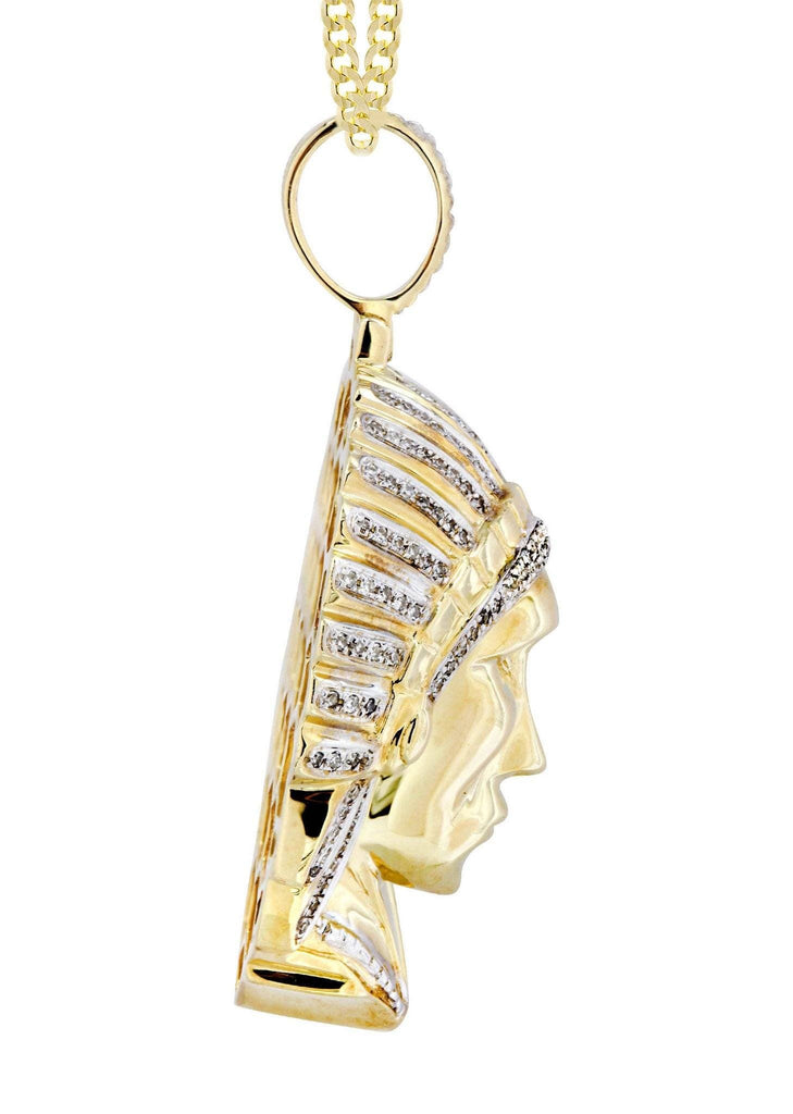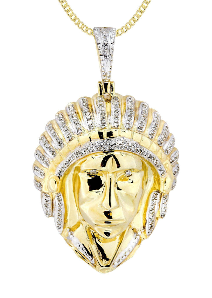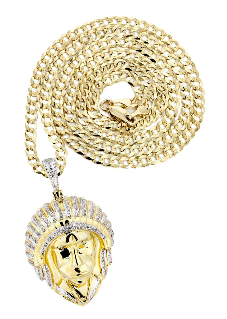10k Yellow Gold Chief Head Diamond Pendant & Cuban Chain which comes in  1.5 Inches in length and  1 Inch in width.  The pendant has  0.29 Carats of Vs quality diamonds.  The chain options include a 10k gold cuban chain, franco or rope with a width of 3mm's and the length can be selected to any preference. -100% REAL GOLD