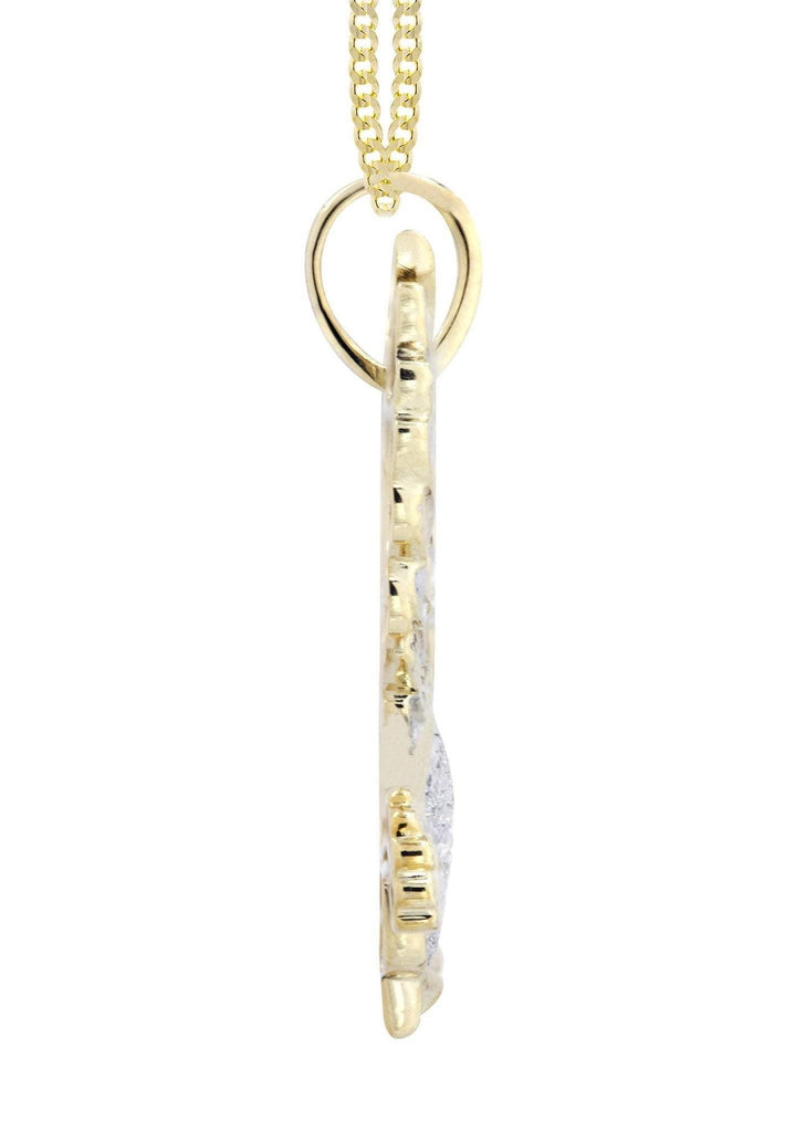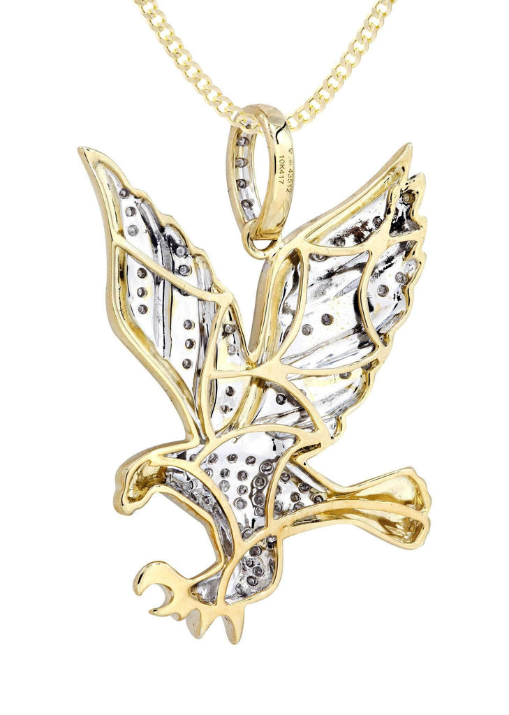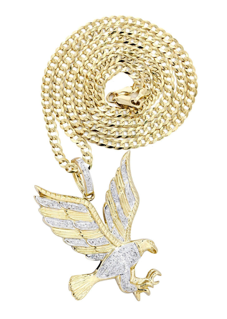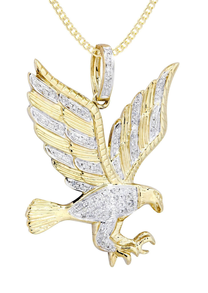 10k Yellow Gold Eagle Diamond Pendant & Cuban Chain which comes in  1.5 Inches in length and  1 Inch in width.  The pendant has  0.27 Carats of Vs quality diamonds.  The chain options include a 10k gold cuban chain, franco or rope with a width of 3mm's and the length can be selected to any preference.-100% REAL GOLD
