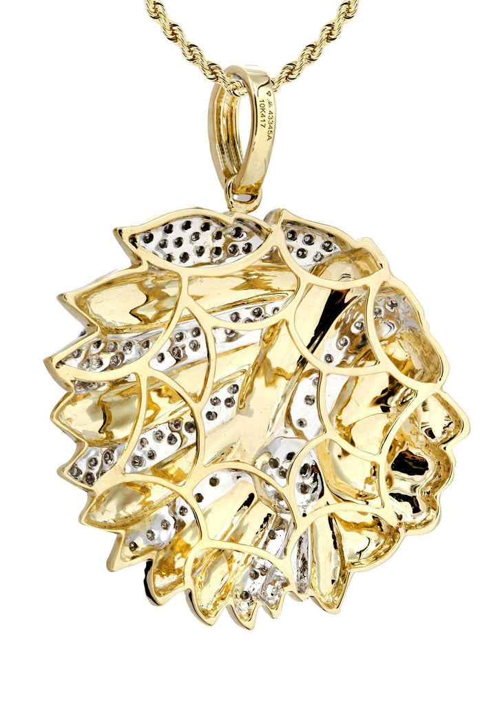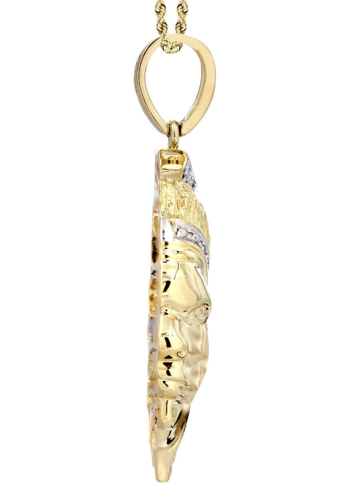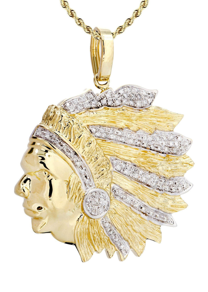 10k Yellow Gold Head Chief Diamond Pendant & Rope Chain which comes in  1.75 Inches in length and  1.4 Inches in width.  The pendant has  0.39 Carats of Vs quality diamonds.  The chain options include a 10k gold cuban chain, franco or rope with a width of 3mm's and the length can be selected to any preference. -100% REAL GOLD