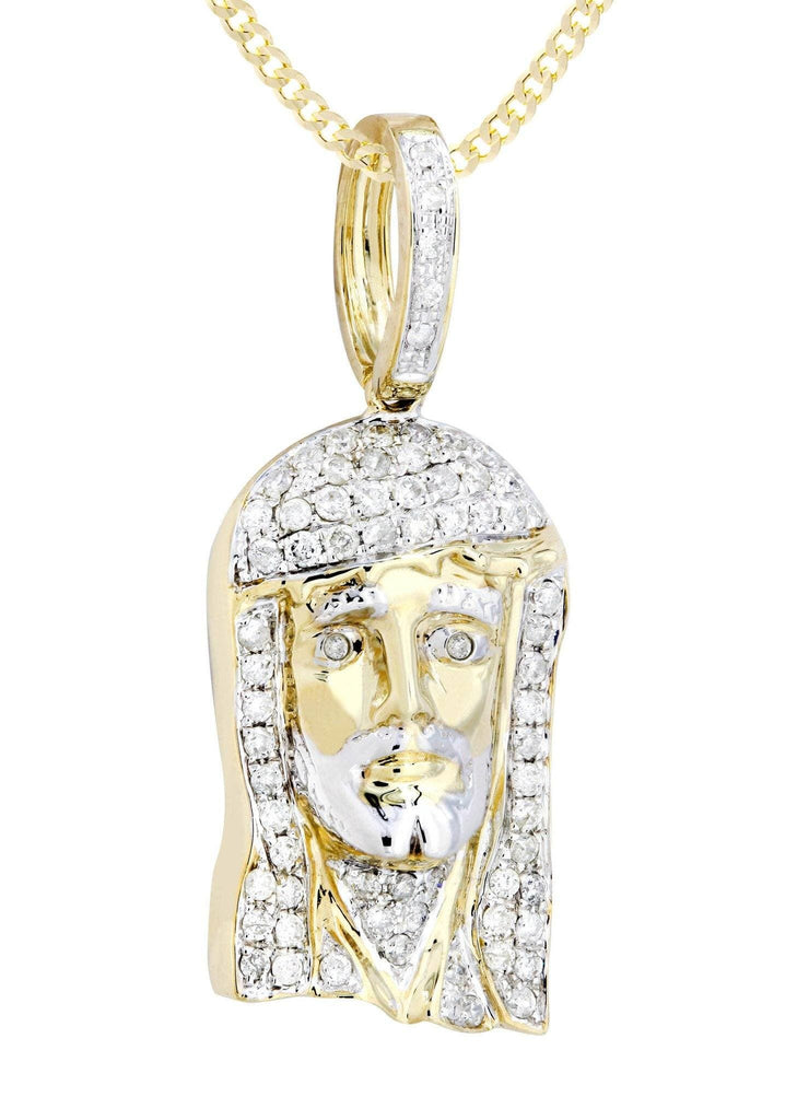 10k Yellow Gold Jesus Head Diamond Pendant & Cuban Chain which comes in  1.4 Inches in length and  0.5 Inches in width.  The pendant has  0.56 Carats of Vs quality diamonds.  The chain options include a 10k gold cuban chain, franco or rope with a width of 3mm's and the length can be selected to any preference. -100% REAL GOLD