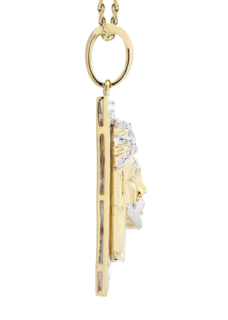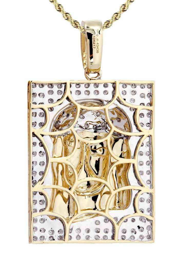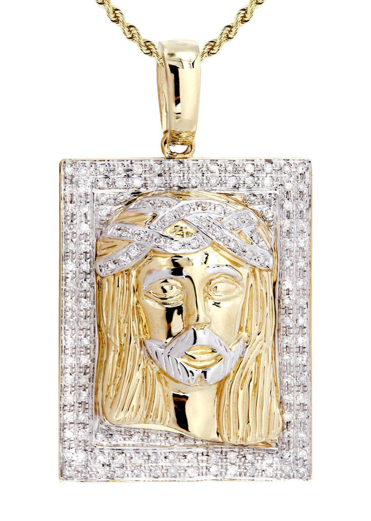 10k Yellow Gold Jesus Head Diamond Pendant & Rope Chain which comes in  1.5 Inches in length and  1 Inch in width.  The pendant has  0.48 Carats of Vs quality diamonds.  The chain options include a 10k gold cuban chain, franco or rope with a width of 3mm's and the length can be selected to any preference. -100% REAL GOLD