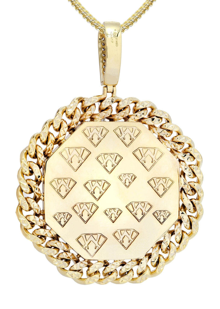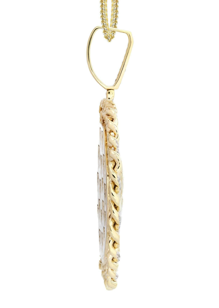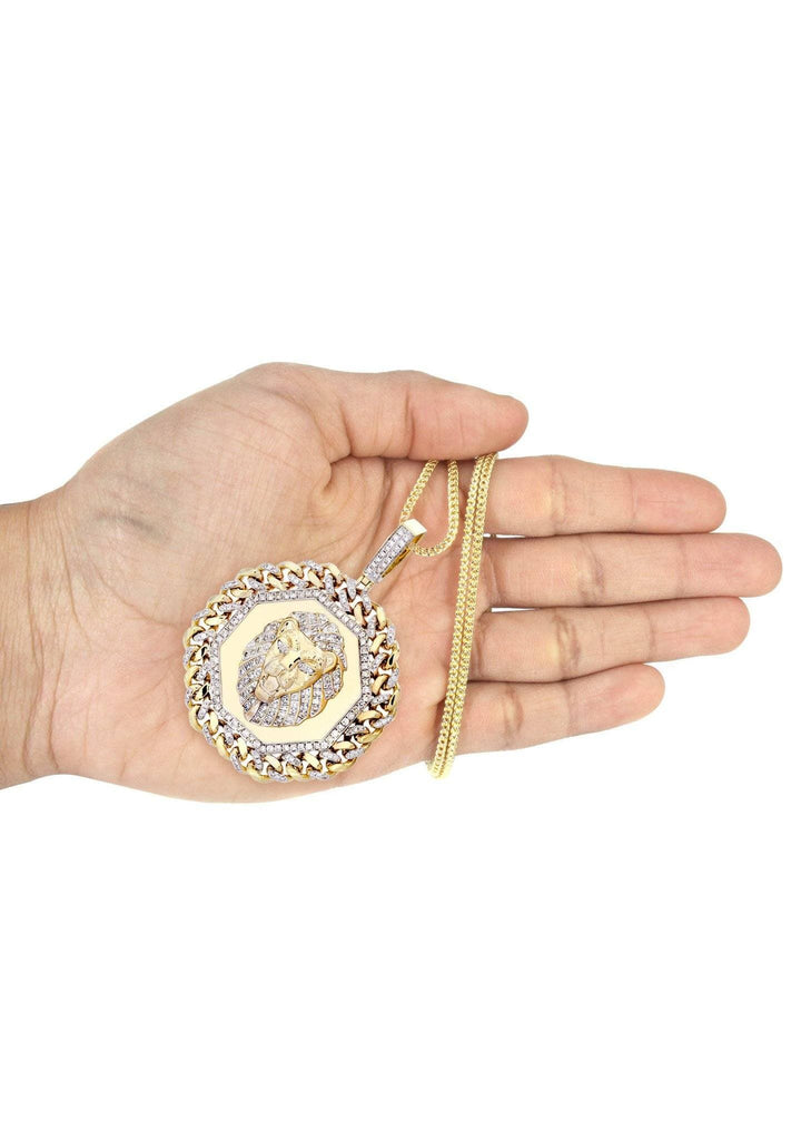 | 10 Yellow Gold Lion Head Diamond Pendant & Franco Chain which comes in 2.9 Inches in length and 2 Inches in width. The pendant has 2.92 Carats of Vs quality diamonds. The chain options include a 10k gold cuban chain, franco or rope with a width of 3mm's and the length can be selected to any preference. |