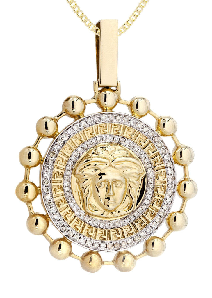 | 10 Yellow Gold Medusa Diamond Pendant & Cuban Chain which comes in 2.5 Inches in length and 1.75 Inches in width. The pendant has 1.39 Carats of Vs quality diamonds. The chain options include a 10k gold cuban chain, franco or rope with a width of 3mm's and the length can be selected to any preference. |