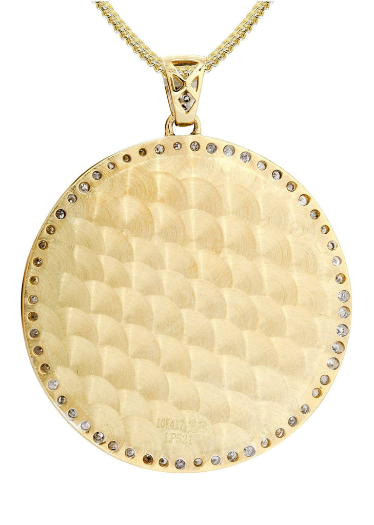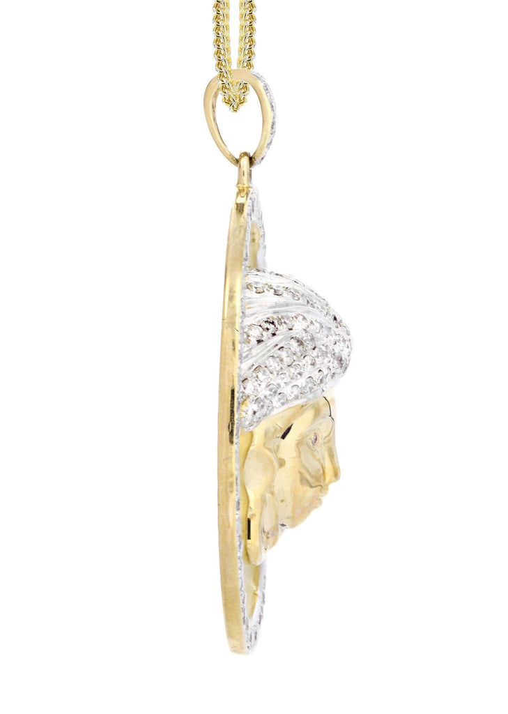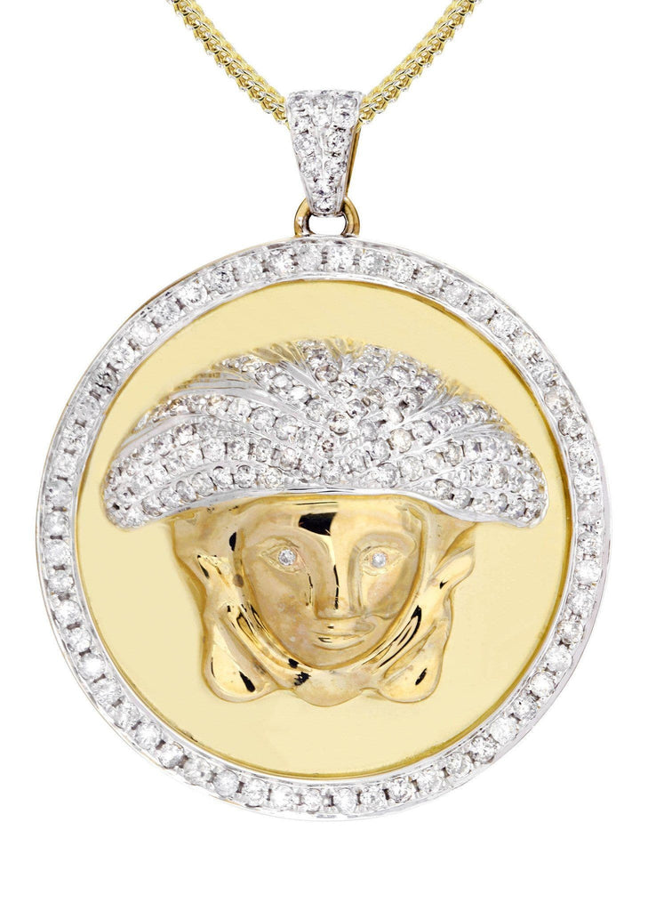 | 10 Yellow Gold Medusa Diamond Pendant & Franco Chain which comes in 1.9 Inches in length and 1.5 Inches in width. The pendant has 2.49 Carats of Vs quality diamonds. The chain options include a 10k gold cuban chain, franco or rope with a width of 3mm's and the length can be selected to any preference. |